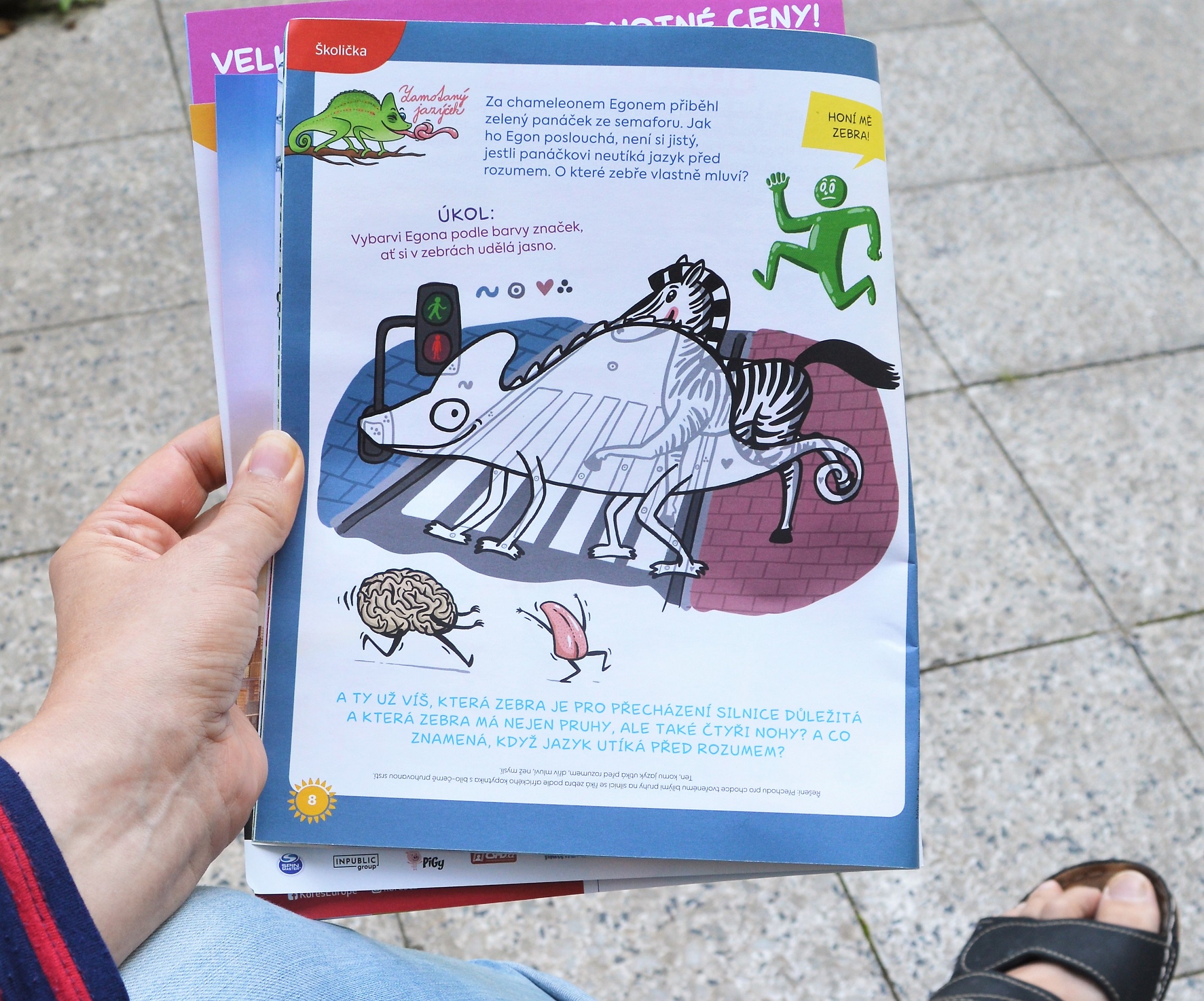 Srpnové Sluníčko přináší opět dvě mé rubriky. Zauzlovaný jazýček chameleona Egona bude tentokrát pátrat po dvou významech slova zebra. Ilustruje Aňos, která se nebojí nakreslit i jazyk utíkající před rozumem. Děda Česlav vezme vnučku Timejku i malé čtenáře na rozhlednu, tedy dokonce na dvě rozhledny. Nebo spíš na jednu rozhlednu dnes a pak ještě před sto lety. Seriál Kdysi a dnes nakreslil Martin Hanschild.