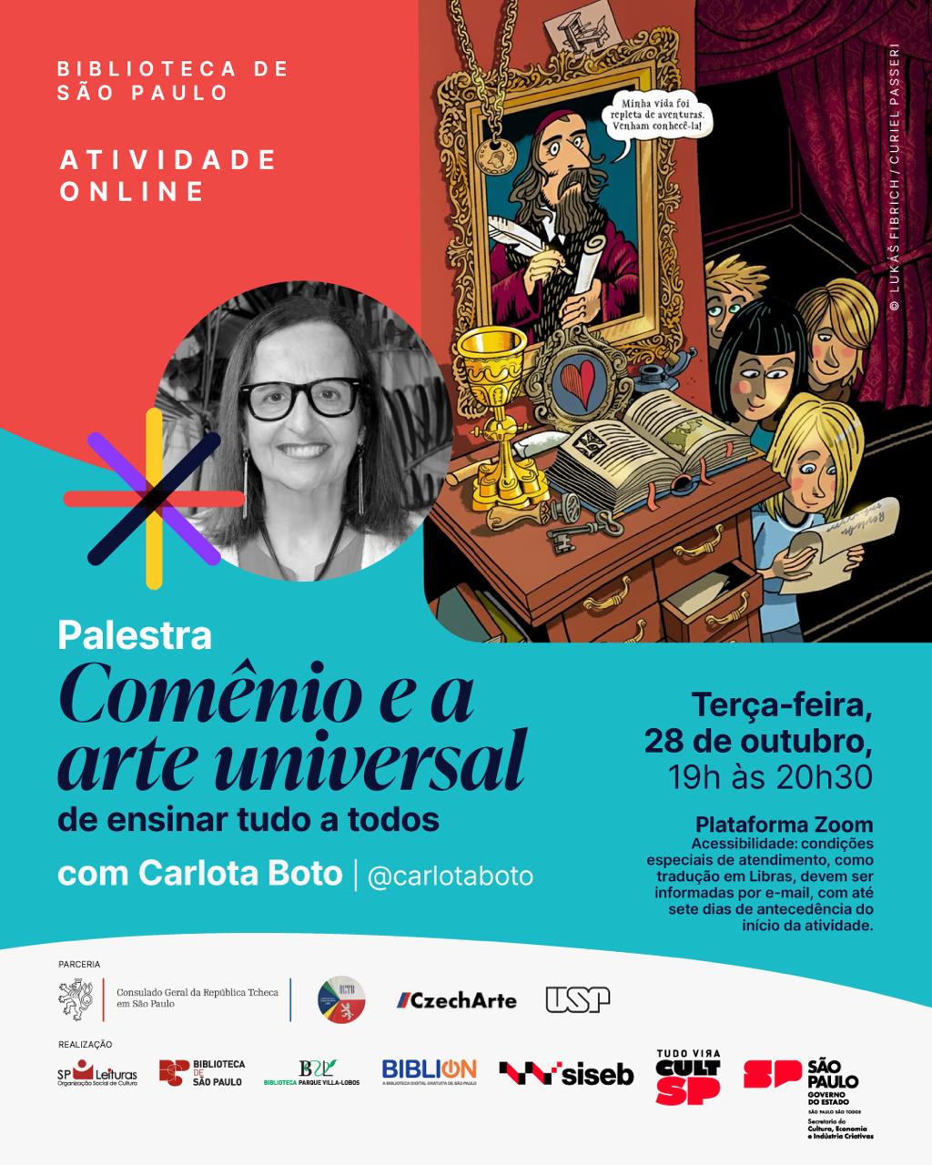📅 28. 10. 2025 od 19:00 (SAO, tedy 23:00 našeho času) se koná bezplatná online přednáška „Comênio e a arte universal de ensinar tudo a todos“ (Komenský a univerzální umění učit všechny všemu) s profesorkou Carlotou Boto z Fakulty pedagogiky Univerzity v São Paulu.