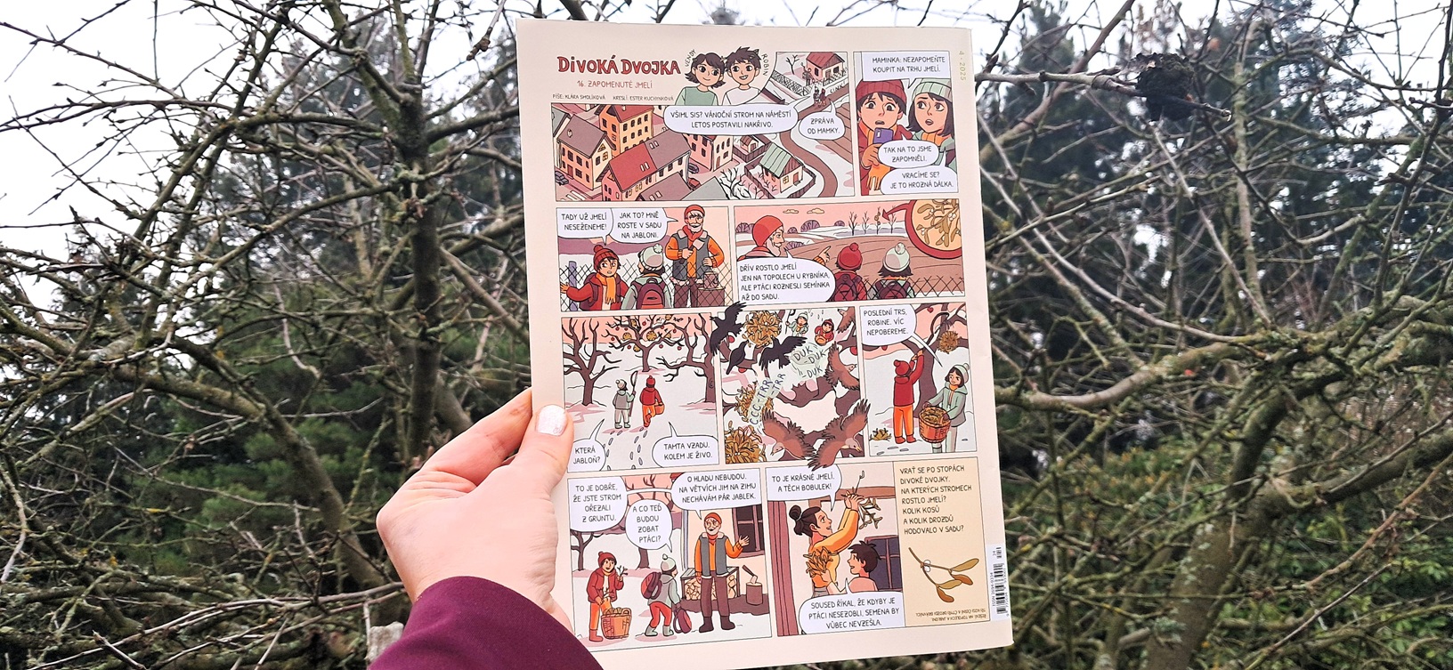 Sníh se ukázal až na konci roku, takže jsem zimní číslo časopisu Ahoj divočino fotila ještě na trávě. Jenže už v první půli prosince je vánoční atmosféra všudypřítomná. Na náměstích i návsích stojí stromky ověšené blyštivými koulemi a světelnými řetězy, do domácností se zavěšuje jmelí. A právě to chybí Vendy a Robinovi, hrdinům komiksového seriálu Divoká dvojka, který se pravidelně objevuje na zadní obálce časopisu. V obrázkovém příběhu se dočteš, kde ho nakonec sehnali.