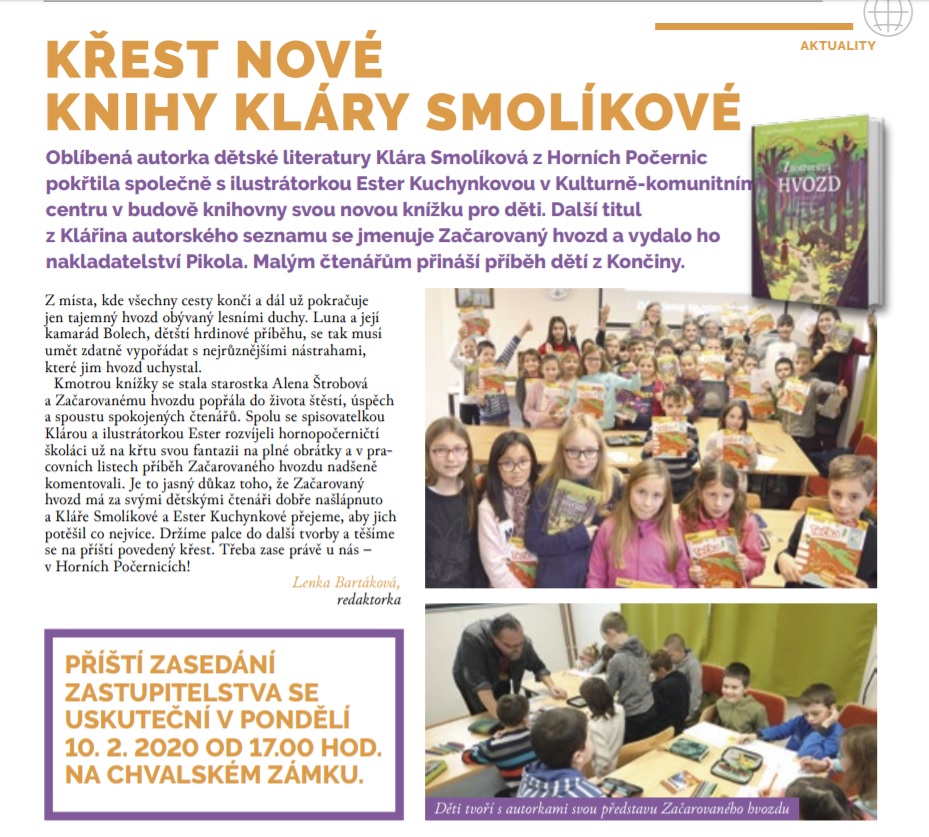 Oblíbená autorka dětské literatury Klára Smolíková z Horních Počernic pokřtila společně s ilustrátorkou Ester Kuchynkovou v Kulturně-komunitním centru v budově knihovny svou novou knížku pro děti. Další titul z Klářina autorského seznamu se jmenuje Začarovaný Hvozd a vydalo ho nakladatelství Pikola. Malým čtenářům přináší příběh dětí z Končiny.