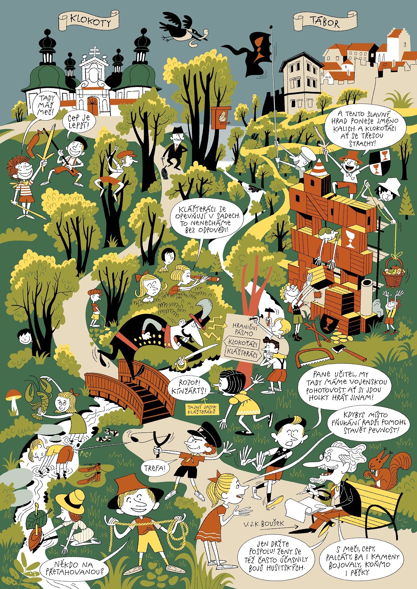 Místní nemají prsty jen v návrhu, ale výrazně se podíleli i na vzniku stezky. „Obsah deseti naučných tabulí rozvrhl a sepsal Tobiáš Smolík, popularizátor historie a lektor, a to na základě konzultací s odbornicemi z Husitského muzea v Táboře, Jitkou a Lenkou Vandrovcovými. Stezka je bohatě ilustrovaná ve svěžím komiksovém stylu, který obrázkům vtisknul známý kreslíř Lukáš Fibrich. Nápady na hravé interaktivní prvky pro nejmenší návštěvníky přispěla spisovatelka dětské literatury Klára Smolíková. Za technickým řešením celých tabulí i interaktivit stojí truhlář Rostislav Kaňa," vyjmenoval Luboš Dvořák klíčové postavy.