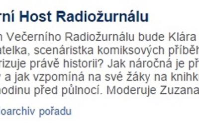 Milá moderátorka Zuzana Burešová mě pozvala v pátek 20. listopadu do studia večerního Radiožurnálu. Povídaly jsme si zejména o nové komiksové revue Bublifuk, ale také o komiksech, čtenářství, Husovi či psaní detektivek. Záznam pořadu je dostupný zde.
