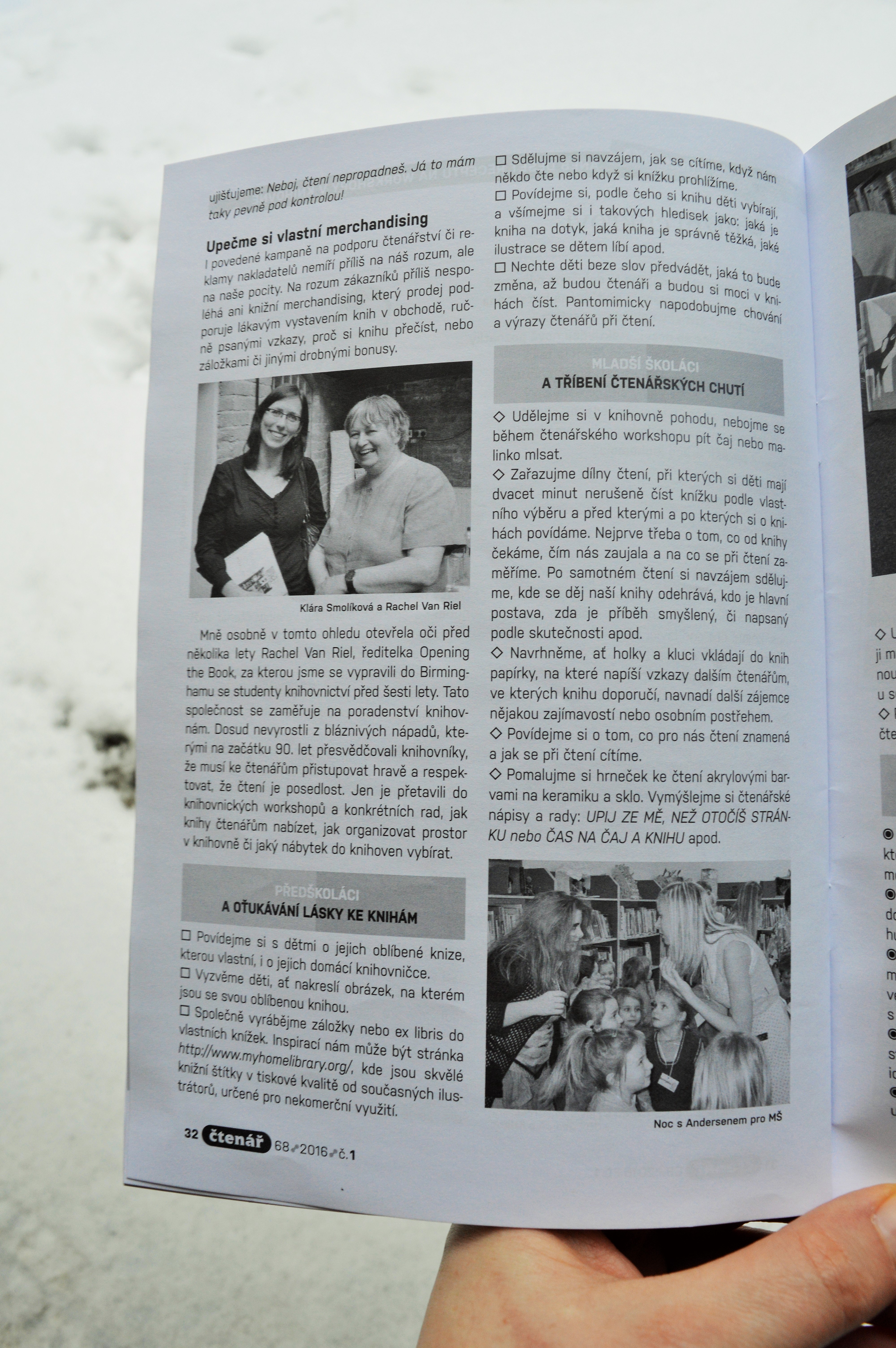 Mně osobně v tomto ohledu otevřela oči před několika lety Rachel Van Riel, ředitelka Opening the Book, za kterou jsme se vypravili do Birminghamu se studenty knihovnictví před šesti lety. Tato společnost se zaměřuje na poradenství knihovnám. Dosud nevyrostli z bláznivých nápadů, kterými na začátku 90. let přesvědčovali knihovníky, že musí ke čtenářům přistupovat hravě a respektovat, že čtení je posedlost. Jen je přetavili do knihovnických workshopů a konkrétních rad, jak knihy čtenářům nabízet, jak organizovat prostor v knihovně či jaký nábytek do knihoven vybírat.