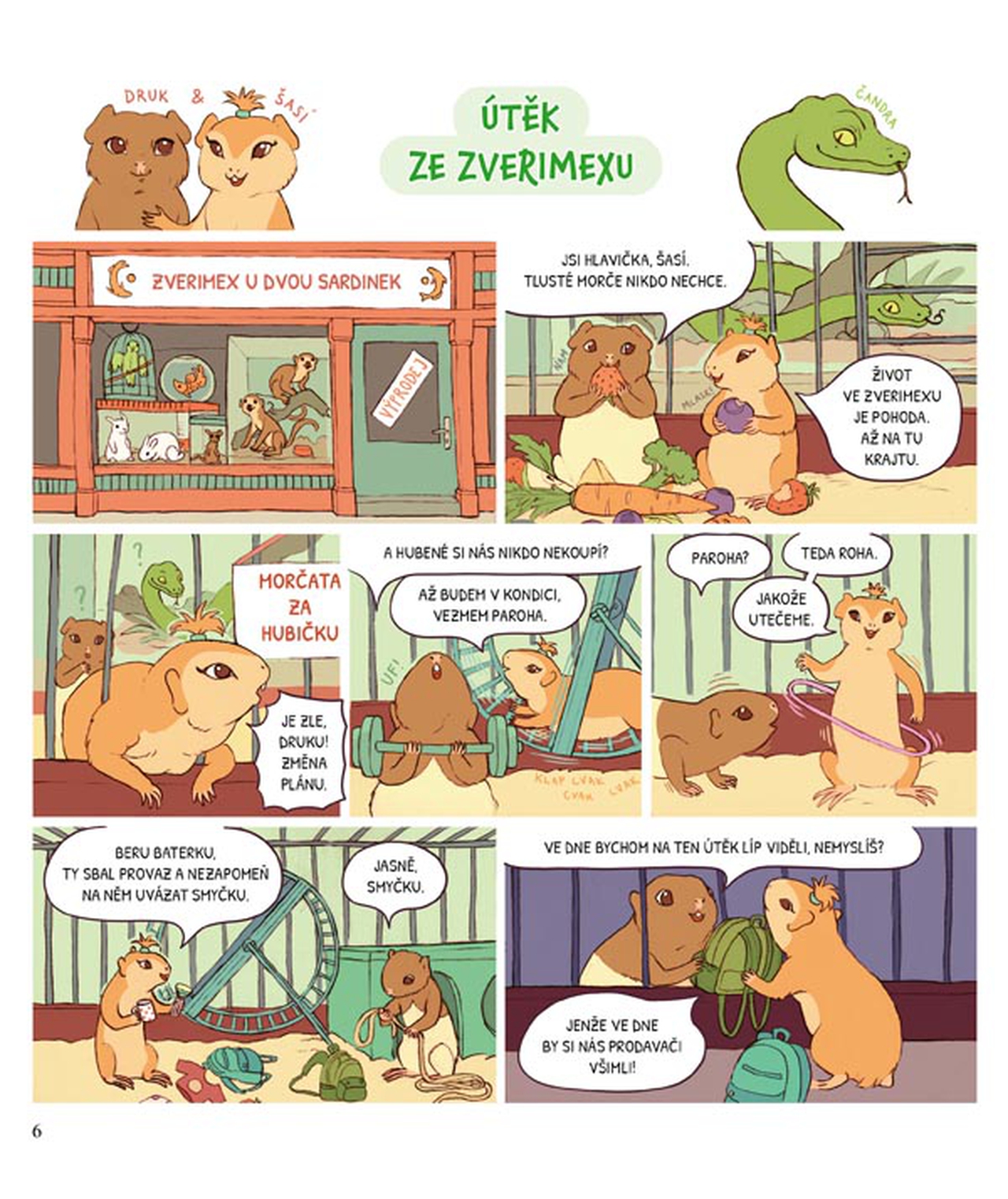 Morčata Druk a Šasí utekla ze zverimexu! Komu se s nimi podařilo proklouznout do městské divočiny? Jak se dvojici na svobodě povede, s kým se uprchlíci seznámí a kde se nakonec zabydlí? V obrázkovém příběhu se vše dočtete, a ještě se dozvíte, jak se ve městě mění počasí, proč by lidé neměli splachovat jídlo do záchodu nebo kdo jsou superhrdinové. Komiksová vyprávění koneckonců morčata i jejich kamarády baví, a tak jsme jejich příhody zachytili právě v komiksech.