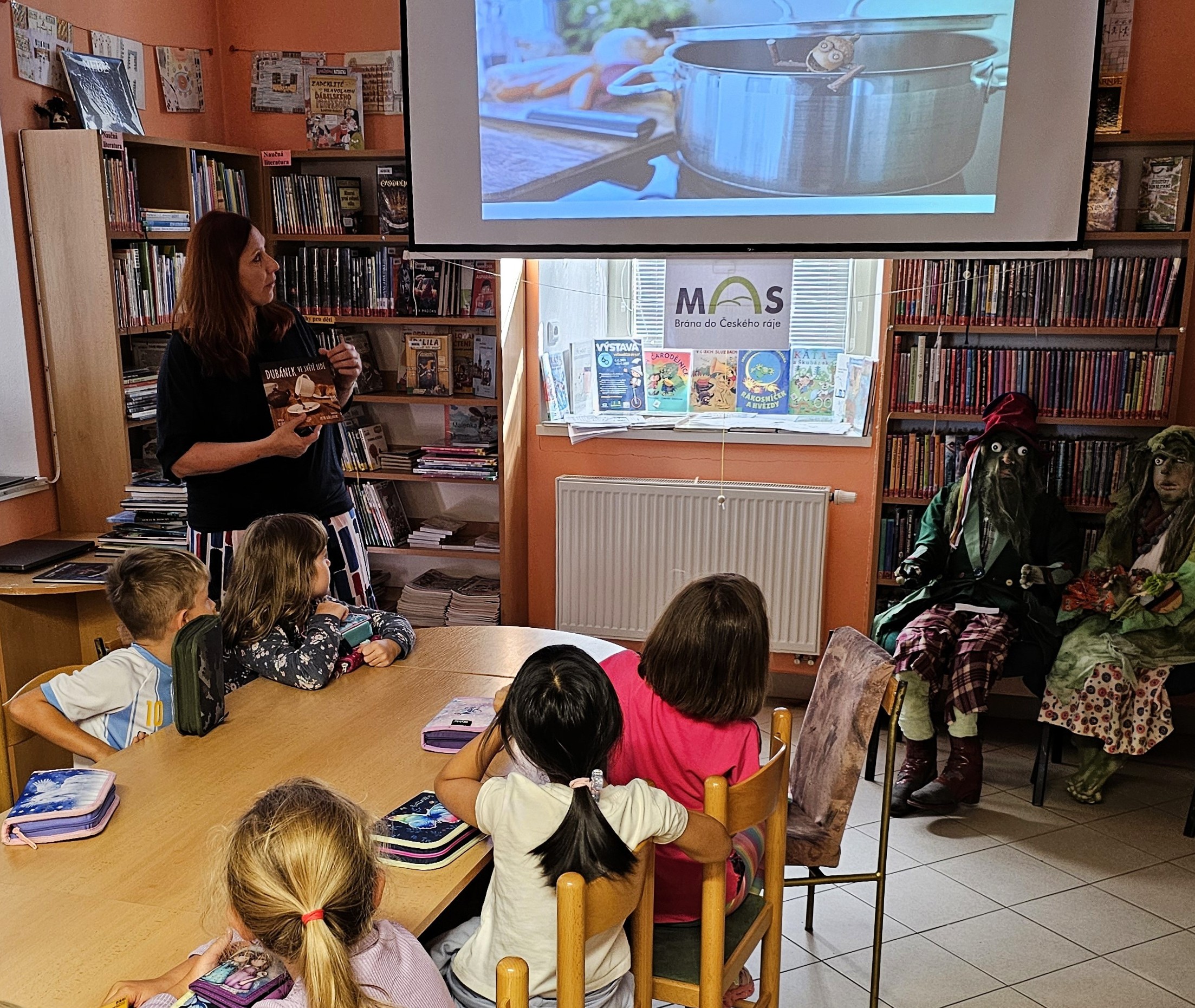 Paní spisovatelka dětem přečetla několik ukázek ze svých knížek např: Vynálezce Alva, Dubánci, Spolkla mě knihovna,… Právě knížka Dubánci zaujala děti i provedením, knížka není ilustrovaná, ale fotografovaná. Je sestavená z vyfotografovaných obrázků. Děti poznaly, že si autor musel Dubánka nejdříve vyrobit a pak ho fotografoval v nejrůznějších situacích, jak pije z velkého hrníčku, visí na stromě za nožičku, schovává se před kočkou,…