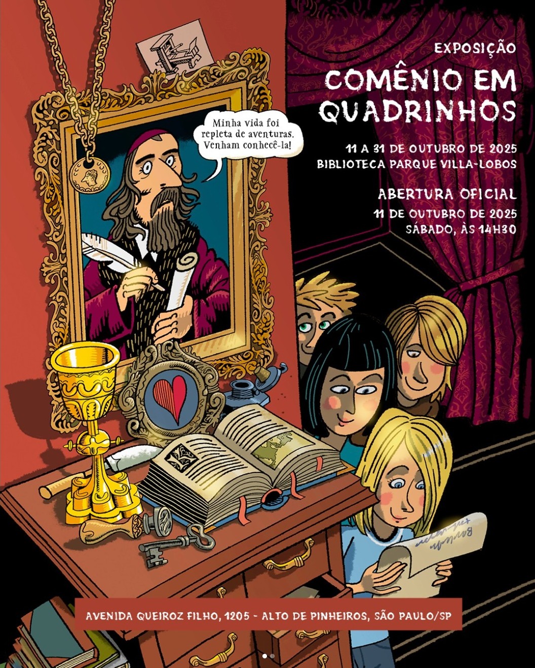 Výstava Komenský v komiksu, kterou jsem připravila pro Národní pedagogické muzeum, putuje po světě. Aktuálně je k vidění v saopaulské knihovně Biblioteca Parque Villa-Lobos, kde díky překladu do portugalštiny od začátku oslovuje i místní publikum. Součástí instalace jsou doprovodné programy pro děti i odborné přednášky. Velké díky patří Věře Matysíkové, která panely s nadšením přeložila a celý projekt v Brazílii zorganizovala, a také Lukášovi Fibrichovi, který komiksy překladu přizpůsobil.
