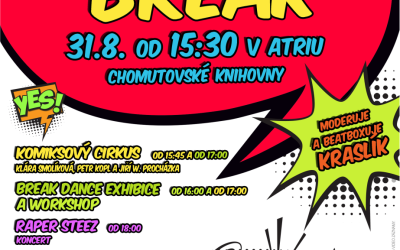 Poslední prázdninové hodiny odpočítali příznivci chomutovské knihovny s komiksem, break dancem a hiphopem. Akce s názvem Komiks break se konala v pátek 31. srpna 2018. Já jsem měla na starosti komiksovou dílnu s menšími dětmi a Petr Kopl se věnoval starším a komiksu znalejším zájemcům. Do třetice nás jistil Jiří W. Procházka.
