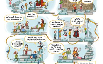 Plakát zachycuje sedm situací: od prvního seznamování a pasování na čtenáře přes besedy a vyhledávání knížek i informací až po tvůrčí dílny a lekce informační gramotnosti. (A taky se v něm prohání spousta myší.)