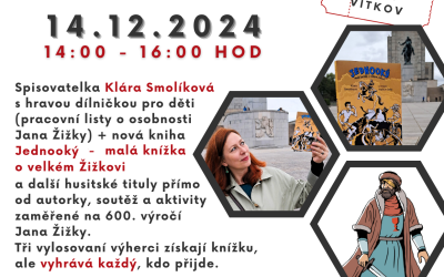 Do kavárny v Národním památníku na Vítkově srdečně zvu v sobotu 14.12. 2024 od 14:00 do 16:00. Pro děti chystám hravou dílnu zaměřenou na osobnost Jana Žižky, k dispozici budou výzvy pro starší děti i omalovánky pro mladší. Dospělí si mohou dát kávu v Café Vítkov, pokochat se výhledem na Prahu, a ještě nakoupit zakoupit knihy pod stromeček. Vše v laskavé organizaci Jany Šmardové, farářky Církve československé husitské.