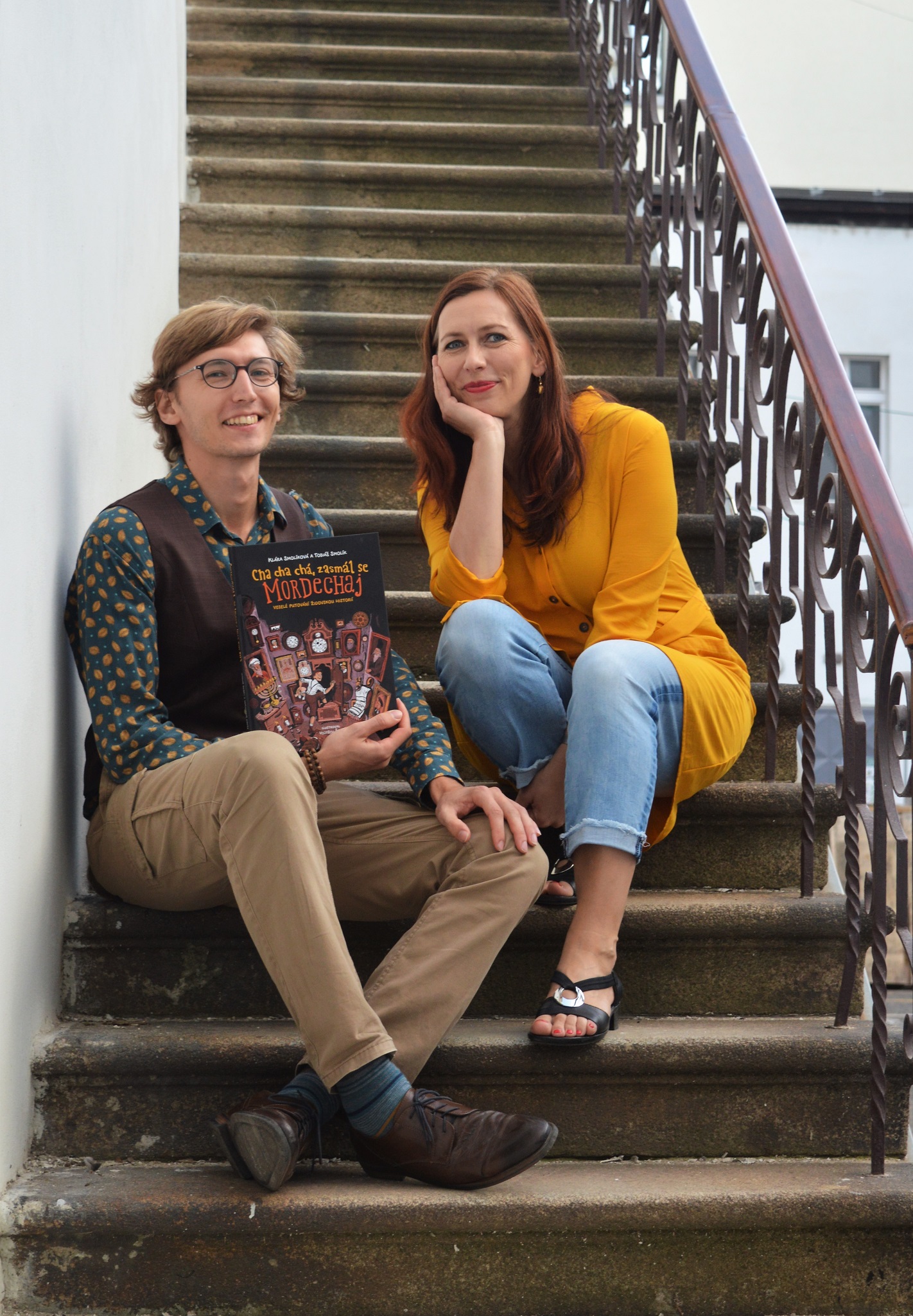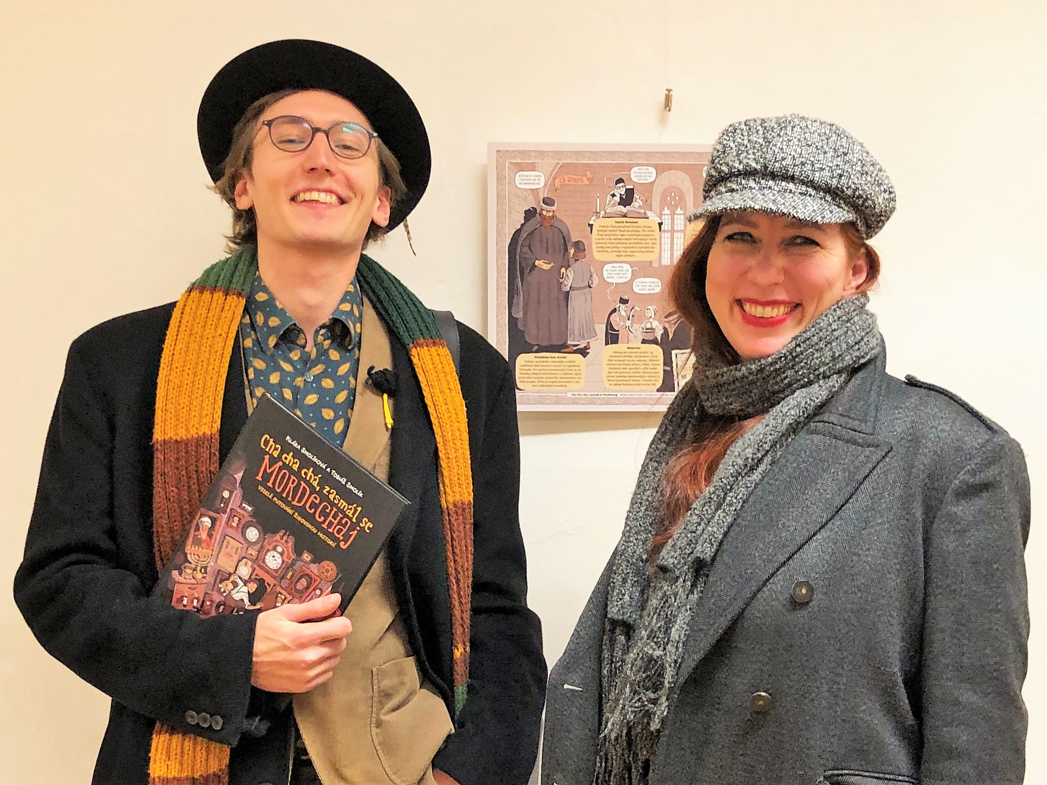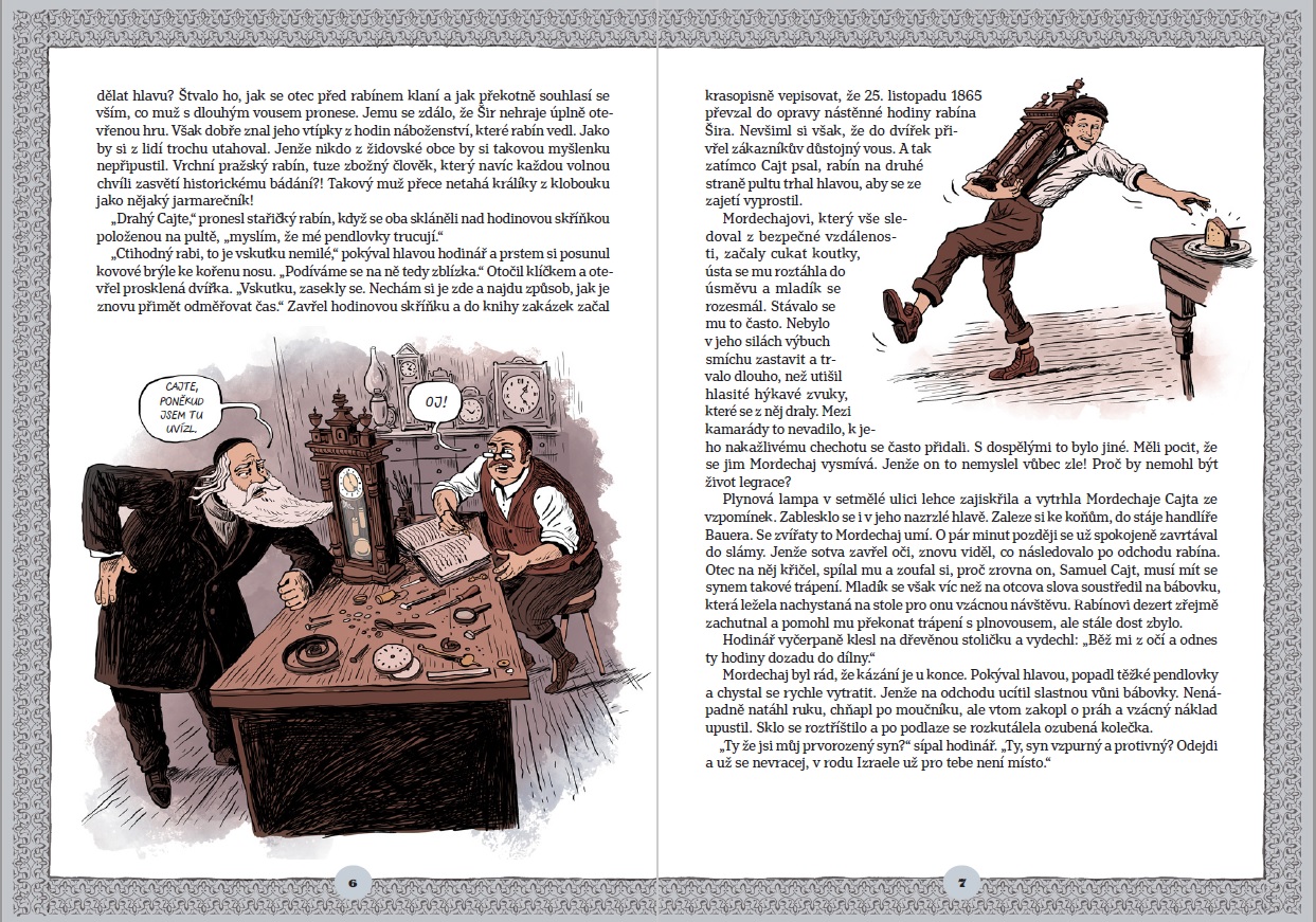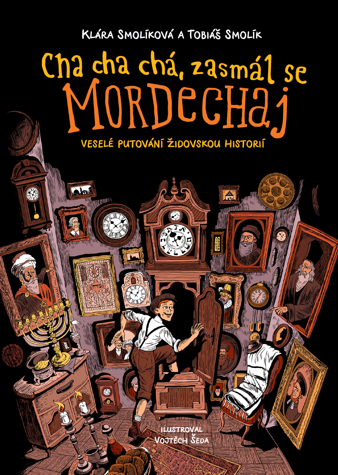 Klára Smolíková (společně s Tobiášem Smolíkem) přichází s pozoruhodným titulem Cha cha chá, zasmál se Mordechaj (Argo, 2020). Jak už jsme si u Kláry Smolíkové zvykli, má ve zvyku popadnout nějaké „suché“ školní téma, napumpovat do něj šťávu vtipu, udělat mu novou frizúru z komiksu, líce mu ozdobit zdravíčkem interesantních detailů, které se jaktěživy do učebnic dějepisu nedostaly, a vyšle ho do světa v balení, po kterém by měl chtít mladý čtenář i jeho osvícený rodič či pedagog sáhnout. Já sahám, a to s největším nadšením. Mordechaj je přehledným průřezem historie židovského národa na našem území do konce 19. století. Tolik se v poslední době vyrojilo knih pro děti, které pojednávají o holokaustu, ale zoufale chyběl začátek příběhu, dějinné objasnění toho, „co bylo předtím“. Takže konečně! Je to čtení pro děti i dospělé, vysvětlující základní pojmy a souvislosti, ale sahající i mnohem hlouběji. Mordechaj Cajt, nezbedný hodinářský syn z konce 19. století, cestuje napříč deseti stoletími a seznamuje se s kořeny své víry. V jedné historické přesmyčce se dokonce ocitá na svatbě svých rodičů a konečně pochopí postoje a názory svého otce. Rámcový příběh Mordechajova putování je napěchován informacemi chytře strukturovanými jak v hlavním textu, tak v doprovodných boxech a občasných komiksových bublinách. Tahle dětská velkoformátová kniha je zásadní především v tom, že přiměje mladého čtenáře vnímat historii židovského národa jako součást jeho vlastní historie, a to i přesto, že on sám možná nemá s židovskou vírou nic společného.