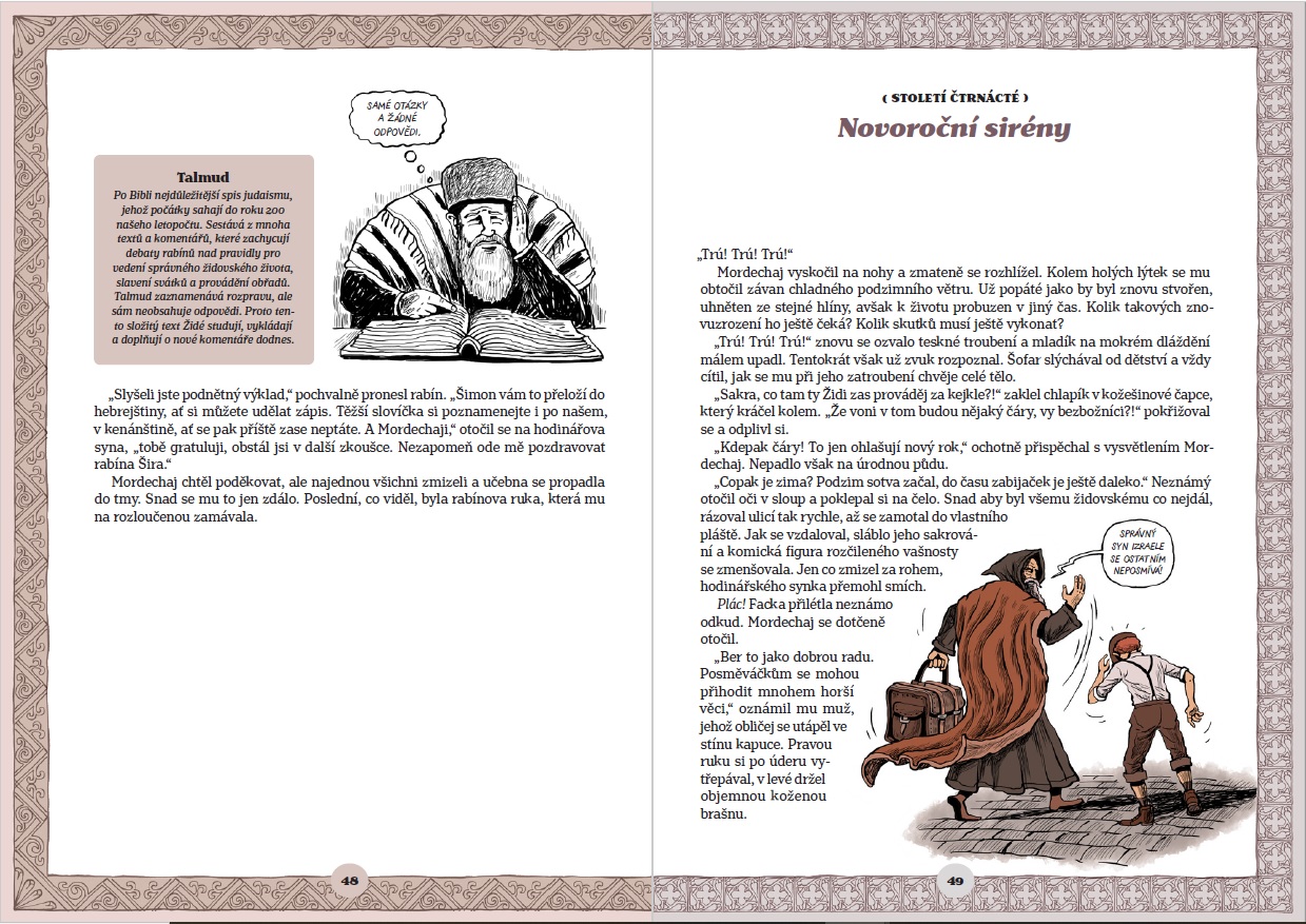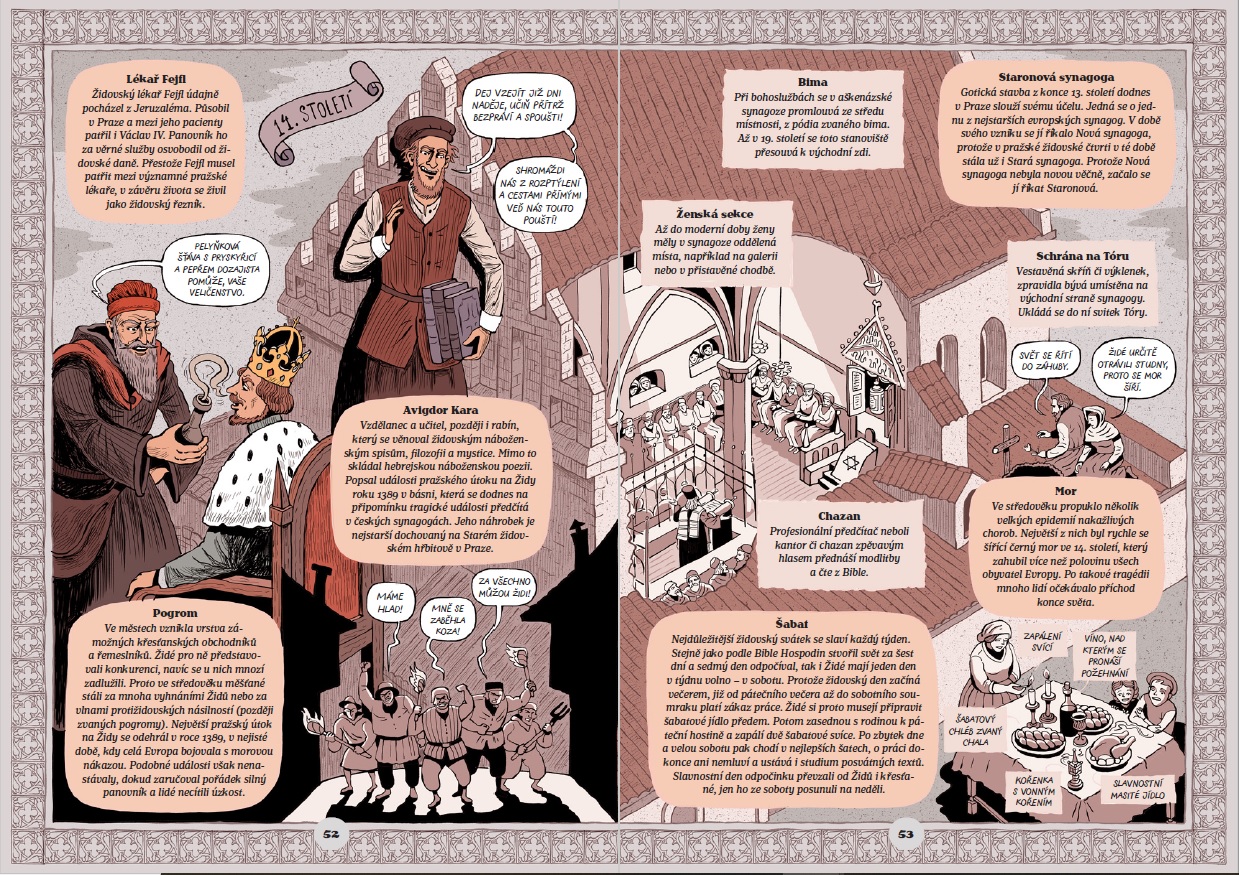 Vydejte se s naším hrdinou napříč deseti stoletími a seznamte se s pozoruhodnými osudy Židů, kteří se usadili a žili v Čechách a na Moravě. Víte, co označují slova Pesach, košer nebo šabat? Zjistěte, proč se dávají na židovské hroby kamínky, co je tóra a kdo byl rabi Löw, jak vypadá židovská svatba a spoustu dalších zajímavostí ze života židovských sousedů. Příběh doplňují celobarevné ilustrované dvoustrany (výtvarník Vojtěch Šeda), které představí významné osobnosti a historické události. Další doplňující informace o jazyku, školství, zvycích, tradicích a svátcích přinášejí infoboxy.