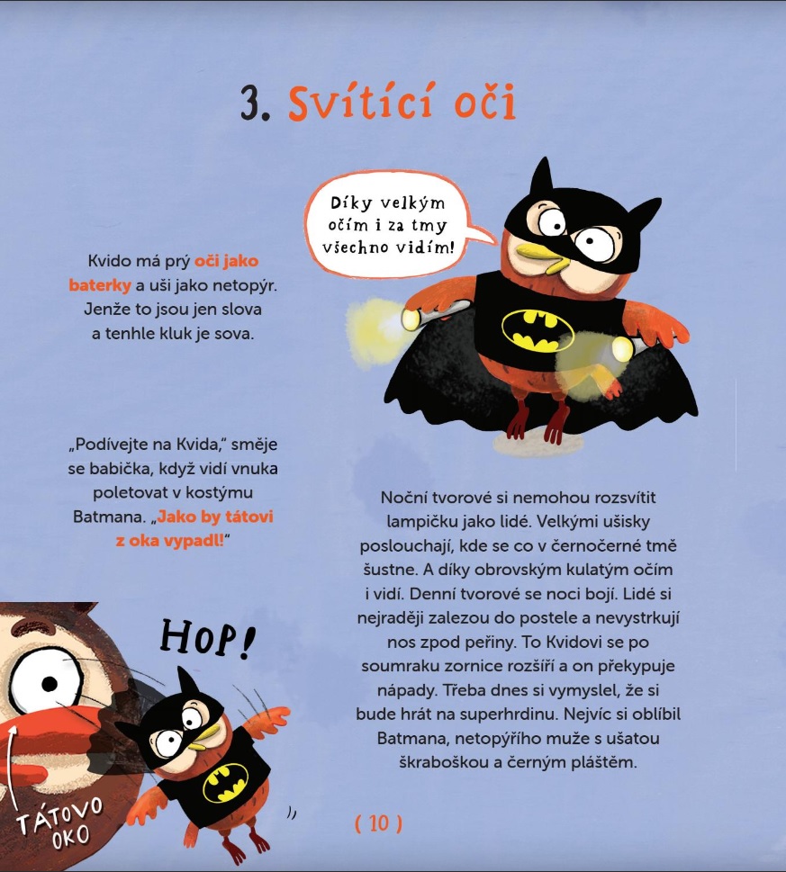 Malý kalous ušatý jménem Kvido se o mnohých slovních spojeních domnívá, že jsou podivná. Nemohl se jen přeslechnout? Jak by mu mohly hořet tváře? A proč o něm kamarádi tvrdí, že chodí spát se slepicemi? Anebo ta slova znamenají něco úplně jiného? Oblíbenou jazykovou rubriku, kterou můžete znát z časopisu Sluníčko, doprovází hravé ilustrace Báry Buchalové. Kniha je určena dětem od 5 let.