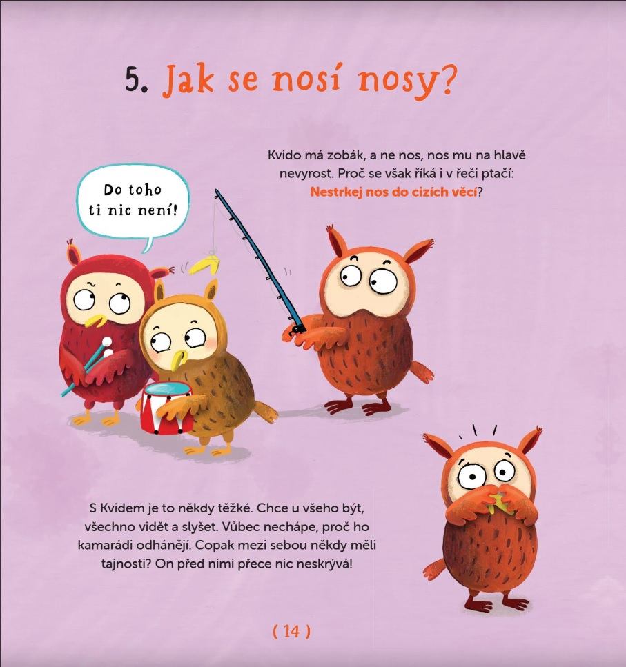 Tato roztomilá knížka hravě a jednoduchým způsobem na situacích ze života objasňuje významy různých rčení. Oficiálně je určená dětem od 4 let, ale navyklým „čtenářům“ určitě můžete předložit i dříve. Díky chytlavým, čitelným a vtipným ilustracím ji ocení i nečtenáři. Děti se nejen pobaví, ale věřím, že díky jednoduché formě, nadupanému obsahu, známým situacím a sympatickému hrdinovi se o rčeních dozvědí spoustu nového.