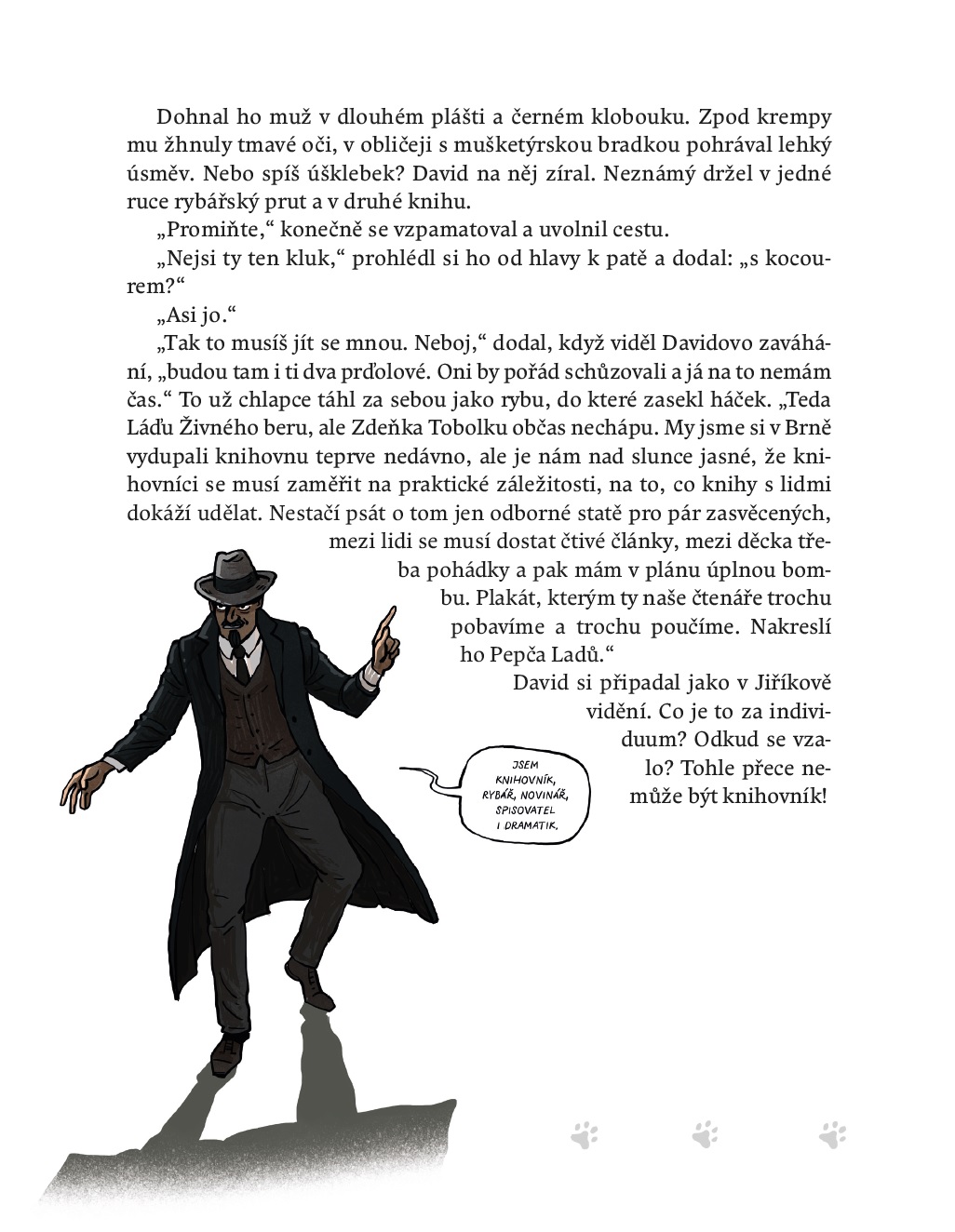 David se vydává na dobrodružnou výpravu po českých a moravských knihovnách, aby svého kočičího kamaráda vystopoval. Necestuje jen v prostoru, musí se prodrat i tokem času a prokouknout slova slavných knihovníků.