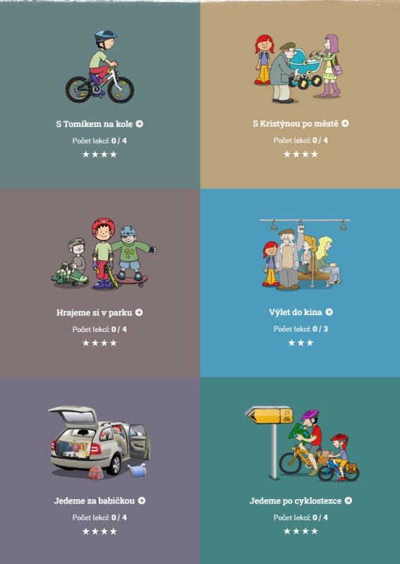 Škoda hrou je zábavně vzdělávací portál o dopravě, ke kterému jsem zpracovávala scénář kapitol v oddíle Silniční bezpečnost. S Tomíkem a Kristýnou mohou děti testovat jízdu na kole, učí se, jak se chovat v dopravních situacích v roli chodců, spolujezdců nebo cestujících městskou dopravou. Web byl dostupný v několika jazykových mutacích na Škoda hrou, nyní na https://www.bezpecnecesty.cz/cz/dopravni-vychova/interaktivni-dopravni-vychova.