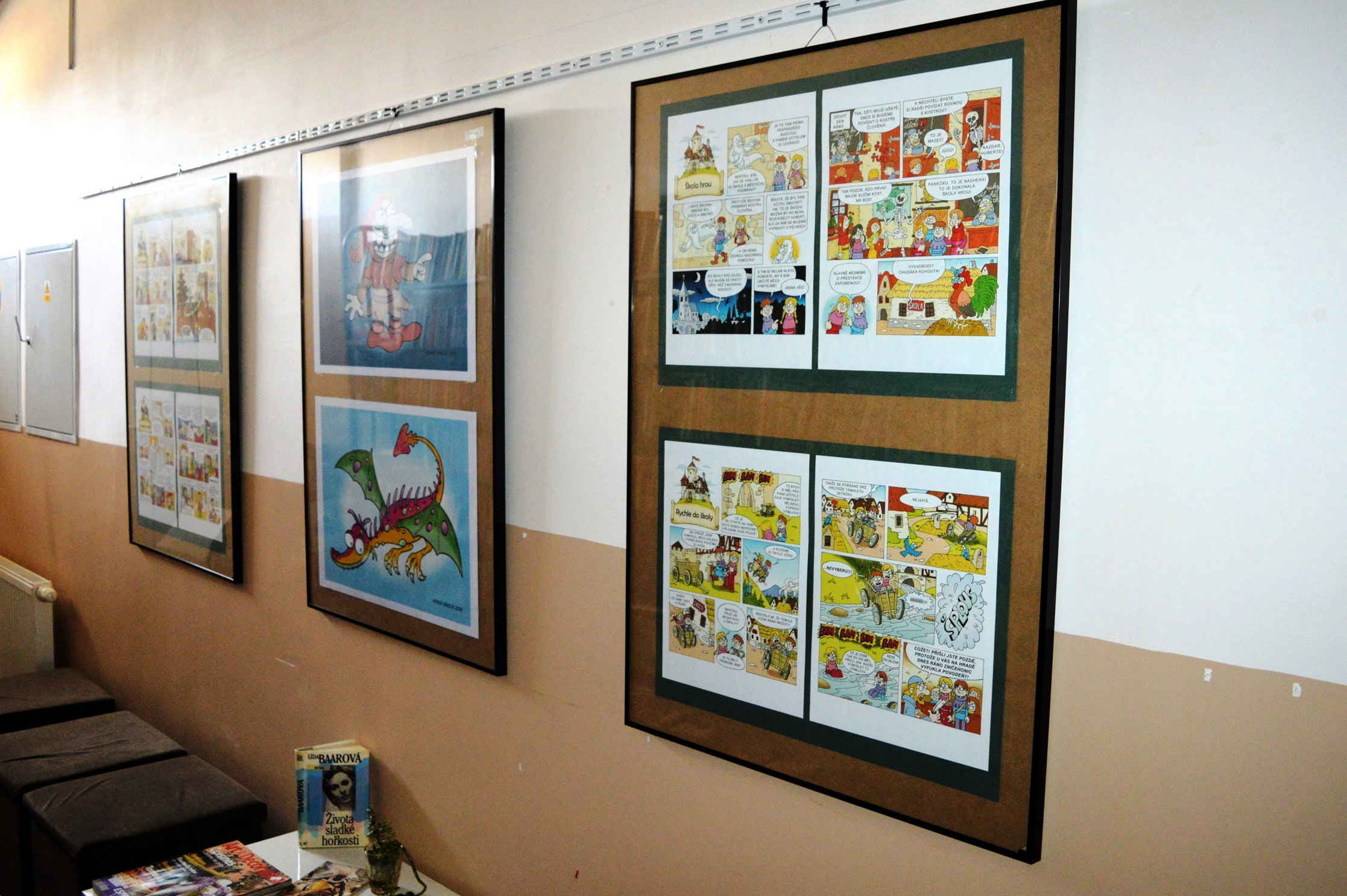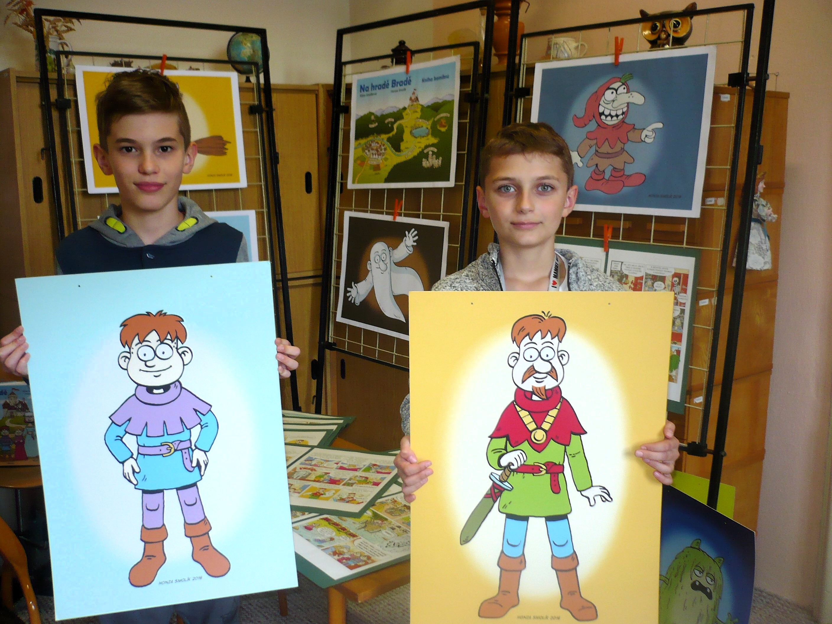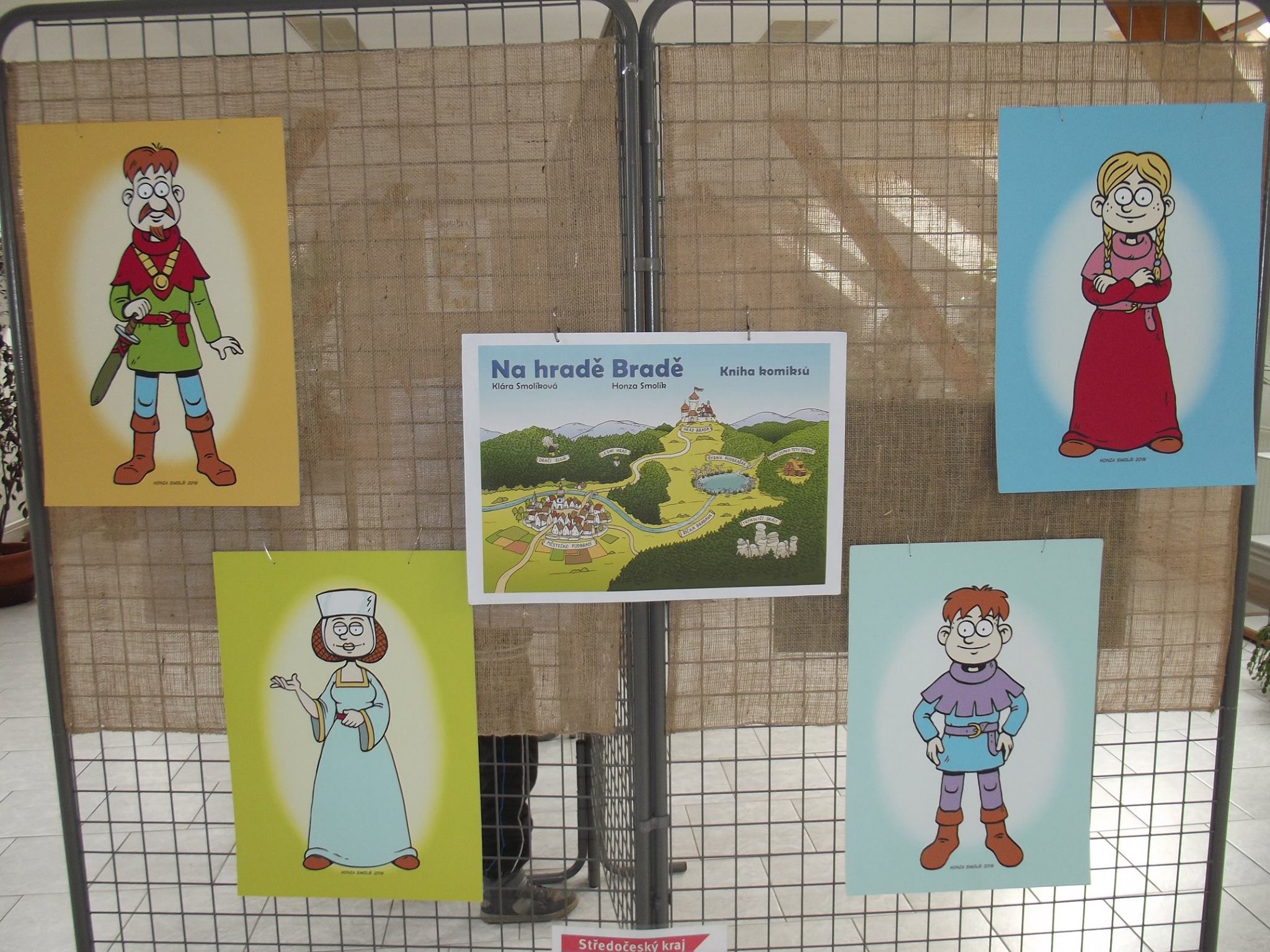 20 komiksů formátu A3 plus 6 velkých obrázků na šířku a 6 obrázků samostatně závěsných na výšku, obojí ve formátu A2 od Honzy Smolíka z knihy Na hradě Bradě