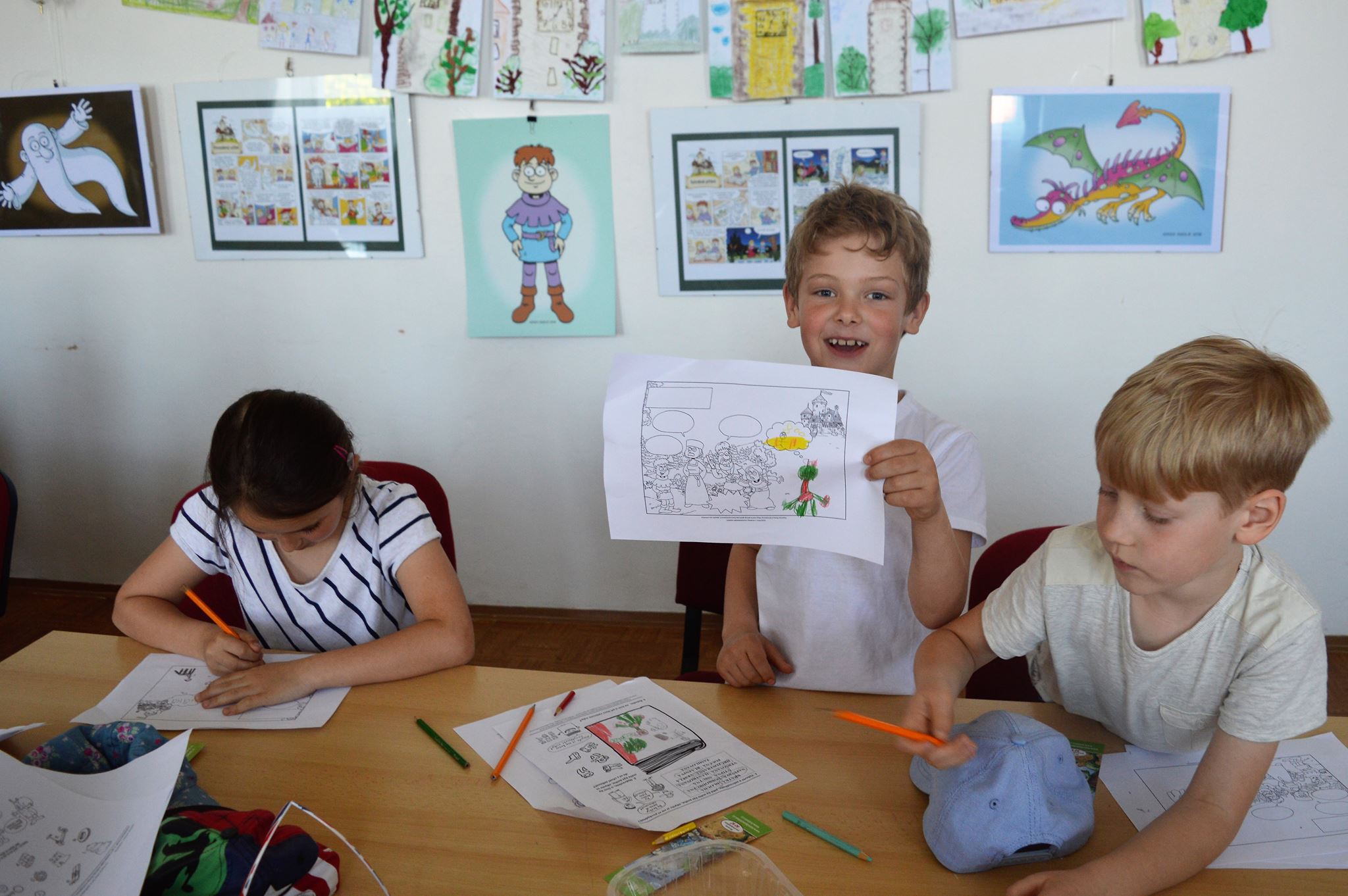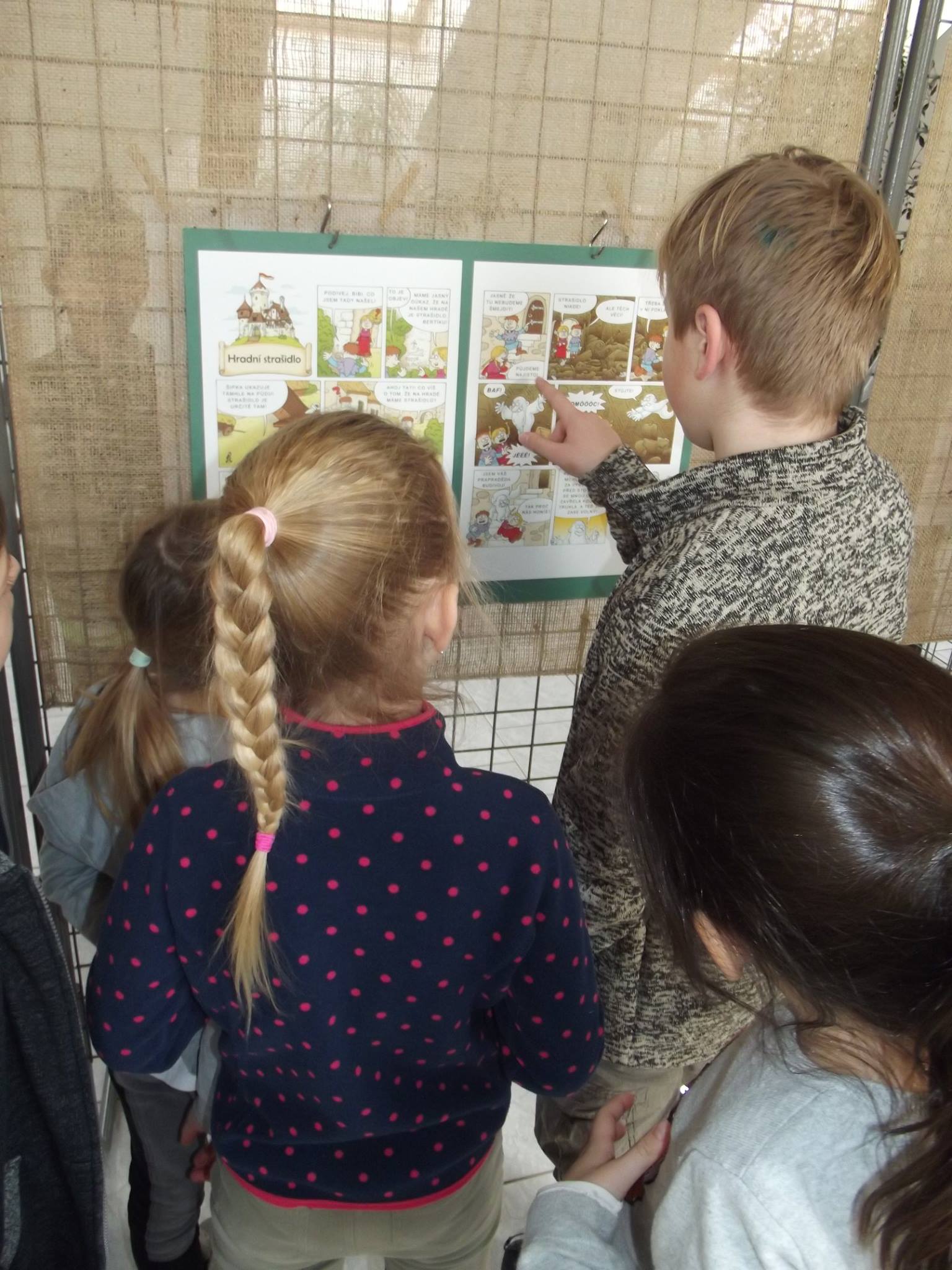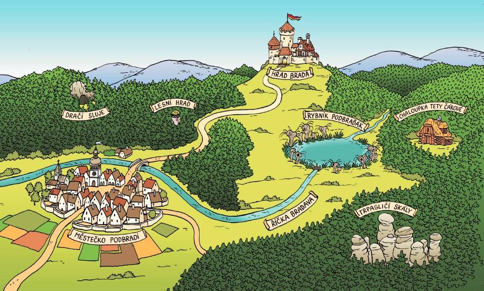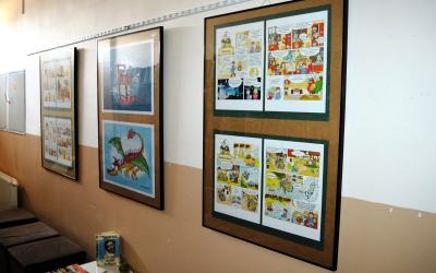 20 komiksů formátu A3 plus 6 velkých obrázků na šířku a 6 obrázků samostatně závěsných na výšku, obojí ve formátu A2 od Honzy Smolíka z knihy Na hradě Bradě