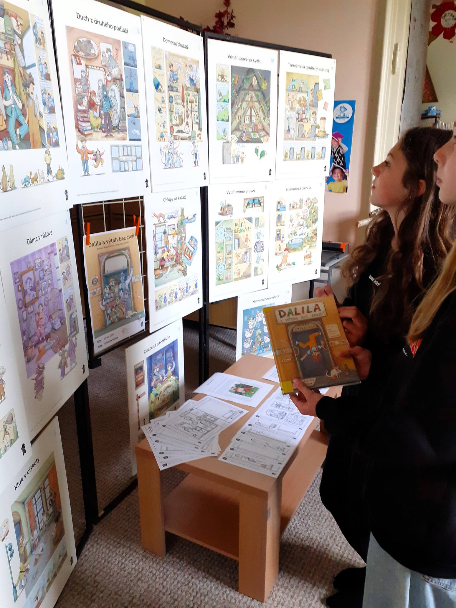 Výstava vznikla na motivy knihy Dalila a výtah bez dveří. Aby návštěvníci rozuměli ukázkám a naplno si užili příběh, doporučuji mít knihu přímo u výstavy – ideálně ve fondu knihovny, školní či třídní knihovničce nebo k zapůjčení poblíž panelů.