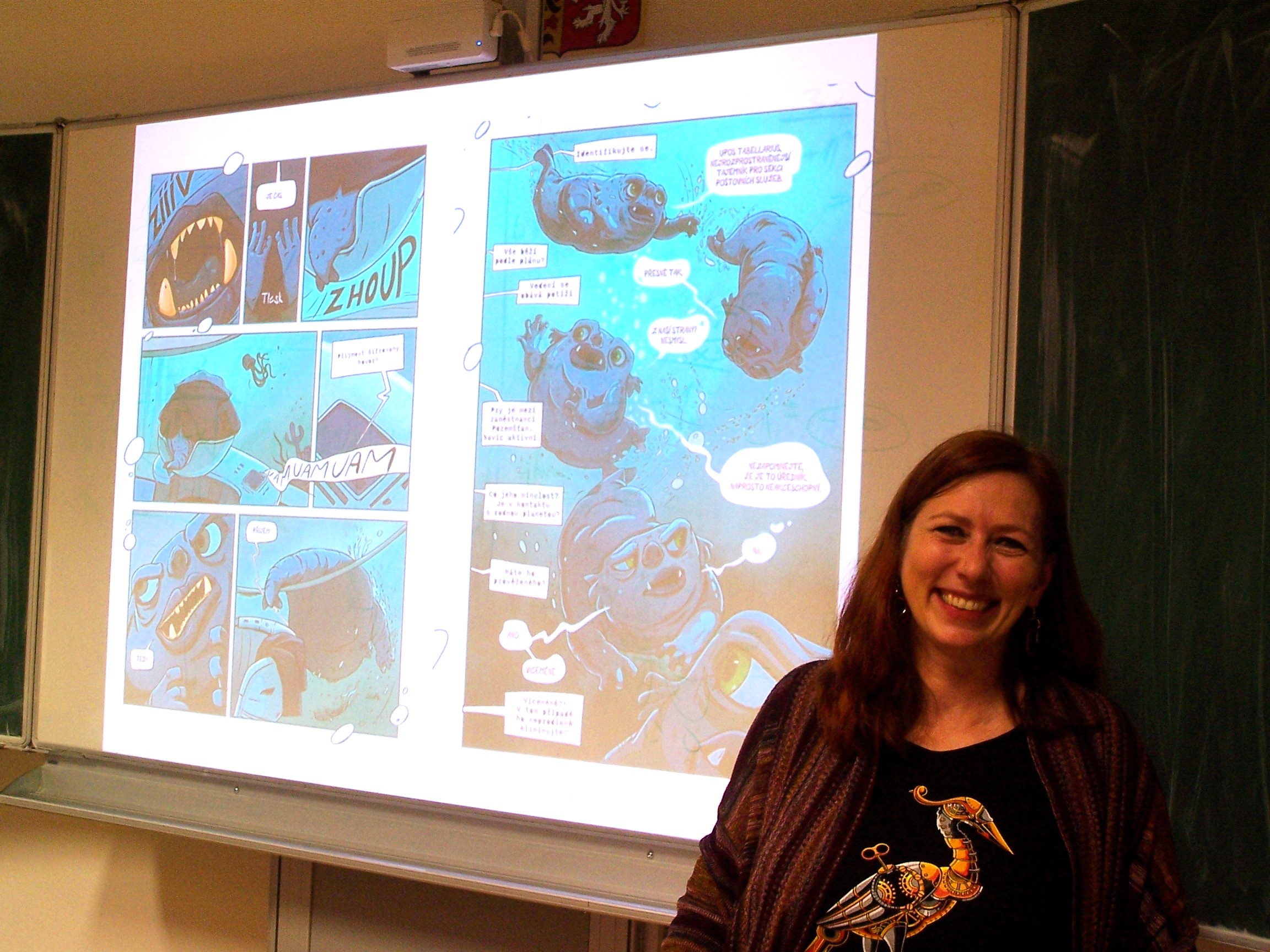 Seznámila žáky se svou tvorbou, prozradila něco z „kuchyně“ vytváření komiksů i knih, ukázala, jak umělá inteligence může pomoci spisovatelům i autorům komiksů.