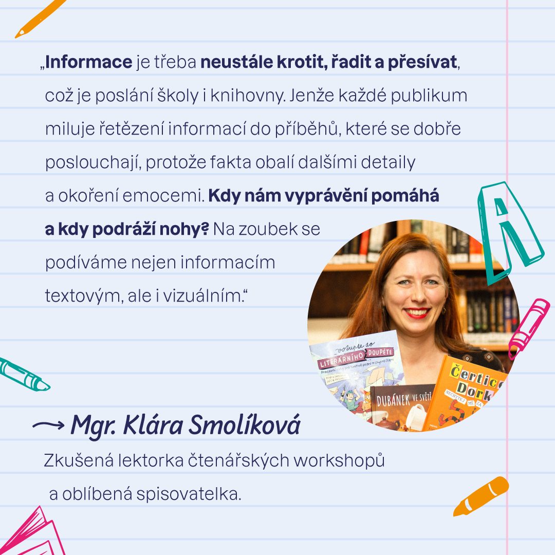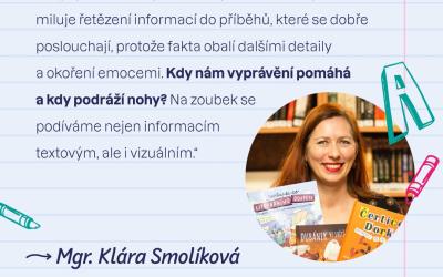Přijala jsem pozvání zúčastnit se podzimní konference Škola a vše kolem ní v aktuálních otázkách a odpovědích. Vystoupím s příspěvkem Informace a síla příběhů, který se bude věnovat informační gramotnosti a odpovědím na otázku, jak být dětem průvodcem v mediální džungli. V následném workshopu Vyprávějte příběh knihy se zaměřím na médium tradiční, ale stále potřebné, a to knihu a rozvoj čtenářství.