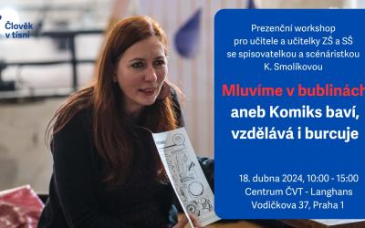 Klára Smolíková provede teoretickou částí a pak se podělí o zkušenosti ze stovek realizovaných dílen ve školách, knihovnách i volnočasových zařízeních. Účastníkům představí lekce, které vytvořila ke svým komiksovým projektům a publikacím. Ve spolupráci s Člověkem v tísni a výtvarníkem Martinem Hanschildem pro seminář připravila materiály, které komiks propojují s aktuálními tématy, jakými je migrace, humanitární pomoc či sociální reklama. I ty si účastníci ze semináře odnesou.