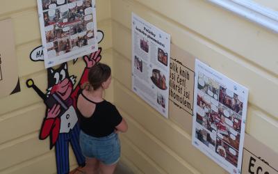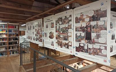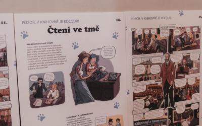 15 závěsných panelů formátu A1 na lehkých plastových deskách s komiksy a ilustracemi Vojty Šedy z knihy Pozor v knihovně je kocour! v listopadu 2024 končí kvůli opotřebování.