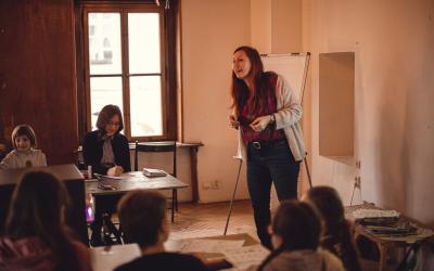 Program uskutečněný např. na letní dílně v klášterní zahradě Broumovského kláštera.