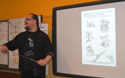 V Týdnu knihoven 2017 jsme v naší knihovně přivítali 3. října již podruhé v tomto roce spisovatelku, scénáristku a lektorku, paní Kláru Smolíkovou a spisovatele a scénáristu, pana Jiřího W. Procházku. Pro naše dětské čtenáře připravili 4 besedy. Tentokrát jsme pozvali i děti z mateřské školy, které si s paní Smolíkovou povídaly o řemeslech. Děti poznávaly nástroje a pak se vydaly za opravdovými řemeslníky - kovářem, pekařem, svíčkařem a dalšími. Povídání s dětmi doplnila paní spisovatelka promítáním krásných obrázků, děti si vybarvovaly pracovní listy a v průběhu besedy byly velmi aktivní. Žáky 2.A a 2.B čekala beseda o vynálezci Alvovi. Zábavnou a hravou formou se druháci dozvěděli, kdo to je vynálezce. Pak se sami pustili do vynalézání. Navrhovali novou podobu knihovny a ve skupinkách vytvářeli a sestavovali zbrusu nové vlastní vynálezy. Žáci 9. třídy pronikali s panem Procházkou do tajemství komiksů. Beseda byla doplněna poutavou prezentací. Žáci sami se do besedy aktivně zapojovali, v pracovních listech si vyzkoušeli, jak komiks vzniká, psali do bublin, zahráli si na komiksové hrdiny, dozvěděli se i o historii komiksu. Děkujeme za všechny besedy, na kterých se děti nejen dobře bavily, ale odcházely také obohacené o zážitky ze setkání s literaturou, knihou.