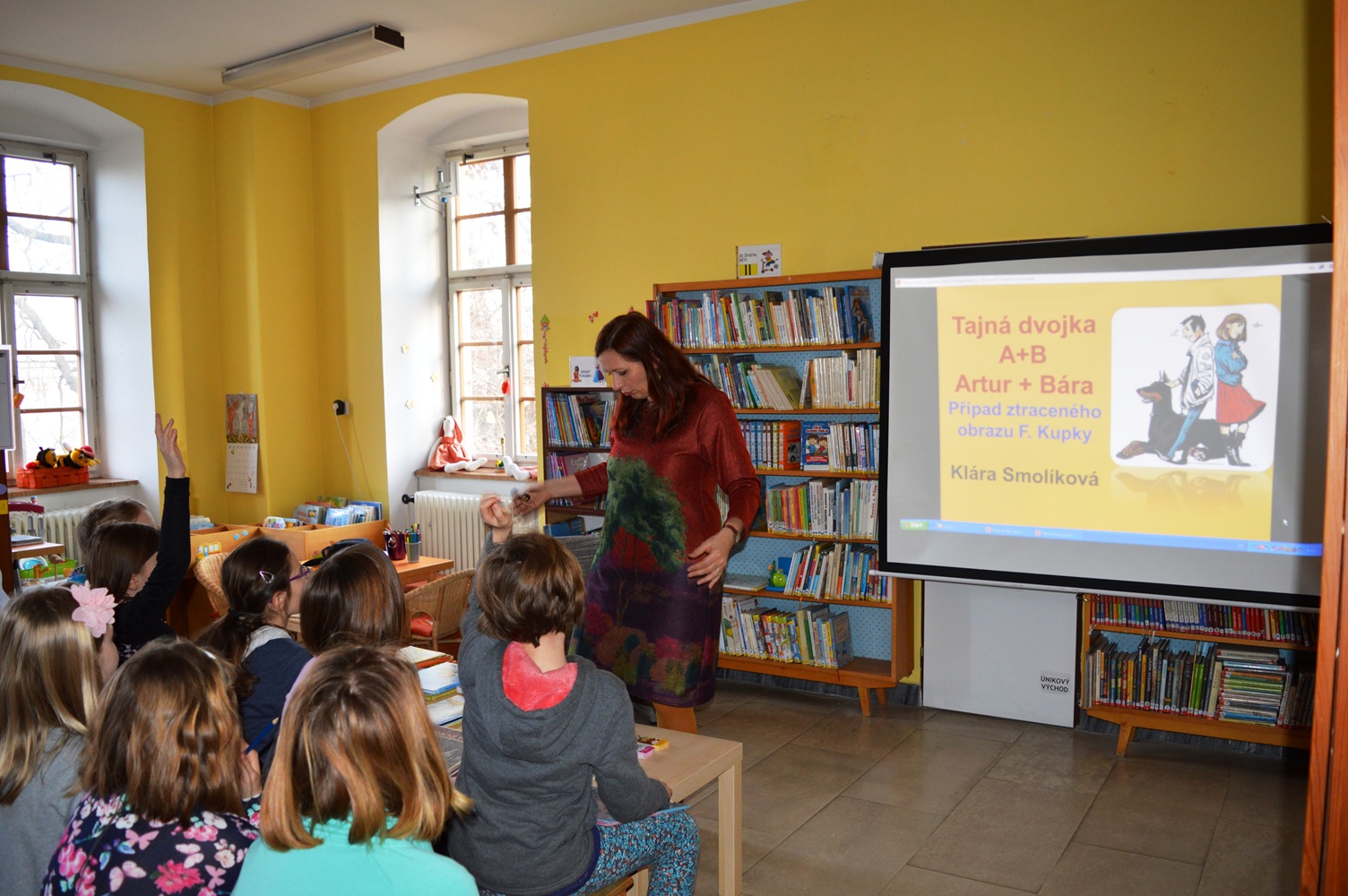 Dne 14. března jsme byli v knihovně na besedě se spisovatelkou Klárou Smolíkovou. Paní spisovatelka a paní knihovnice pro nás připravily detektivní povídání. Řešili jsme případ ztraceného obrazu Františka Kupky Waterfall. Plnili jsme úkoly z pracovních listů.