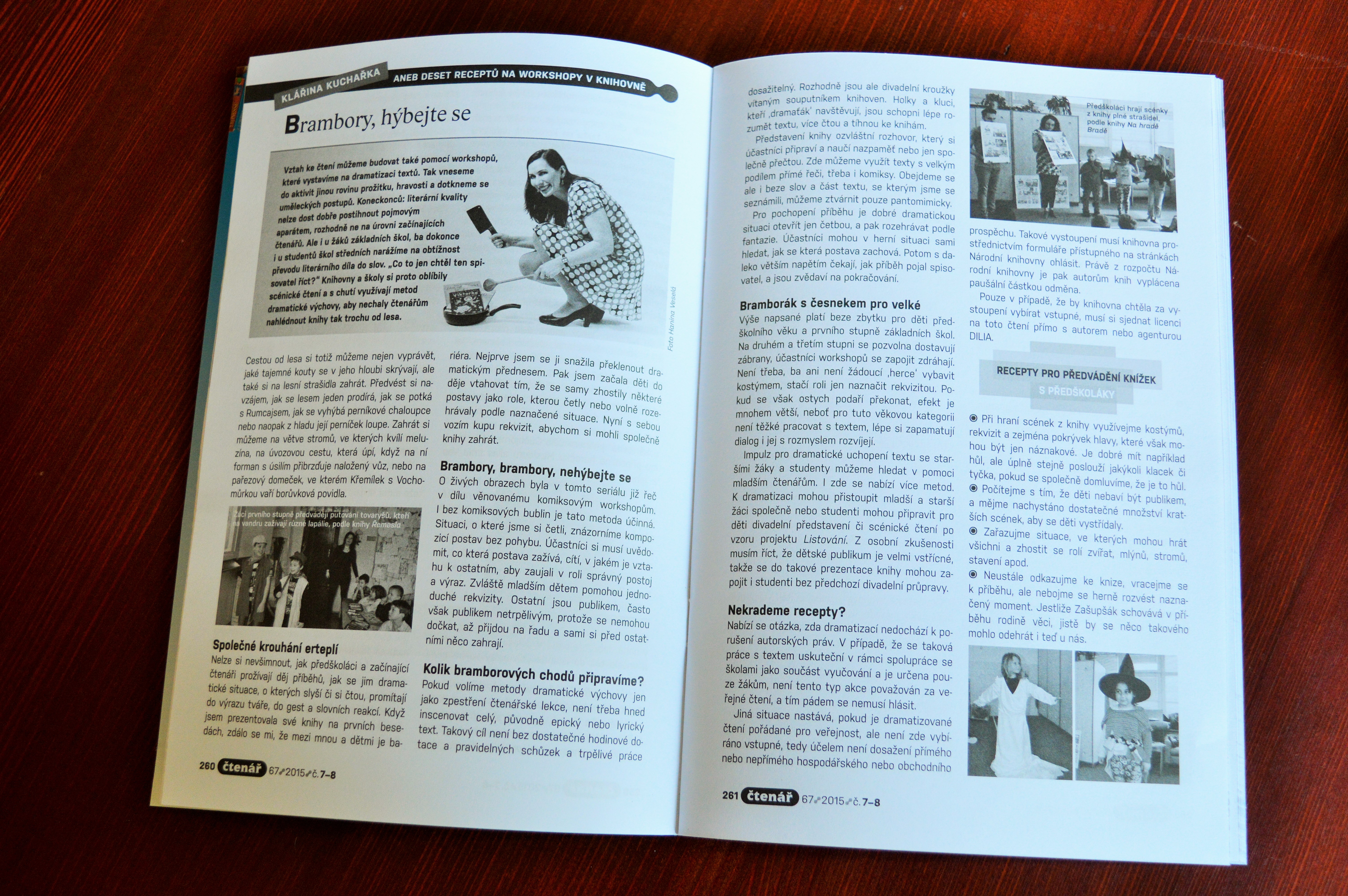 Do letního čísla časopisu pro knihovny Čtenář jsem přispěla dalším pokračováním rubriky Klářina kuchařka aneb deset receptů na workshopy v knihovně. Jmenuje se "Brambory, hýbejte se" a přibližuje využití metod dramatické výchovy prři čtenářských workshopech a lekcích.