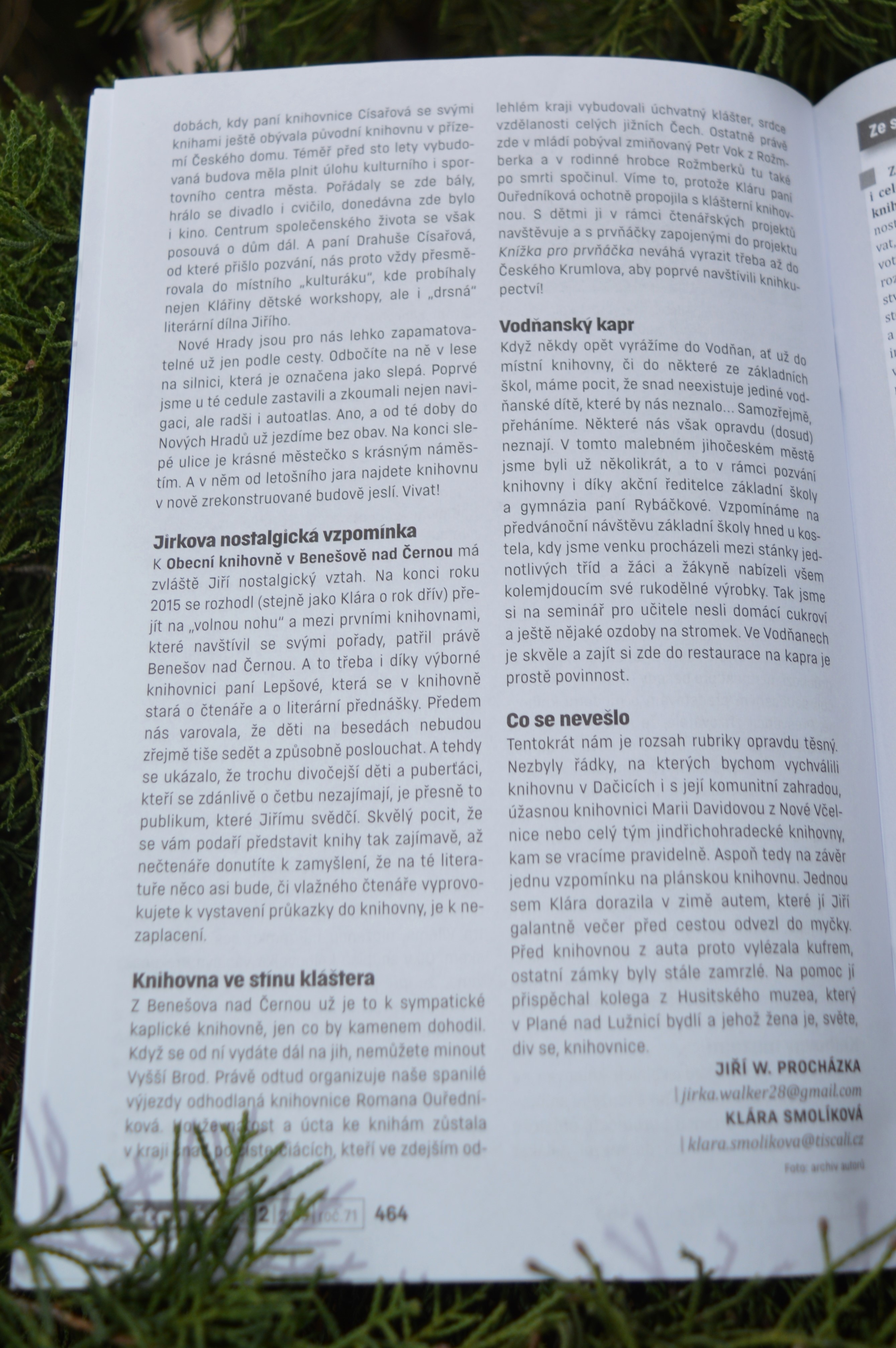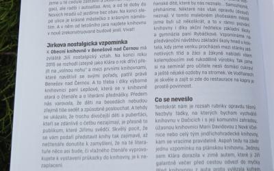 Tentokrát nám je rozsah rubriky opravdu těsný. Nezbyly řádky, na kterých bychom vychválili knihovnu v Dačicích i s její komunitní zahradou, úžasnou knihovnici Marii Davidovou z Nové Včelnice nebo celý tým jindřichohradecké knihovny, kam se vracíme pravidelně. Aspoň tedy na závěr jednu vzpomínku na plánskou knihovnu. Jednou sem Klára dorazila v zimě autem, které jí Jiří galantně večer před cestou odvezl do myčky. Před knihovnou z auta proto vylézala kufrem, ostatní zámky byly stále zamrzlé. Na pomoc jí přispěchal kolega z Husitského muzea, který v Plané nad Lužnicí bydlí a jehož žena je, světe, div se, knihovnice.