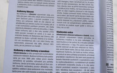 Středočeská vědecká knihovna v Kladně, která je zároveň vydavatelem tohoto periodika, je knihovnou krajskou a na svou velkolepou secesní budovu je tak pyšná, že ji má jako ústřední motiv vetknutou i v logu. Pro autory není jednoduché cestovat za akcí pro veřejnost do města, kde nemá žádné vazby. Zde se však výtečně daří naplňovat myšlenku, že hosté se mohou střídat, ale pokud se akce pořádají pravidelně, přicházejí pravidelně i návštěvníci. Byl jsem sem pozván na besedu Fenomén audioknih s vyprávěním o vzniku audiovydavatelství, o problémech při stavění a zařizování zvukového studia, a to vše samozřejmě proložené veselými historkami z natáčení. Návštěva byla excelentní – 35 lidí všeho věku, samých nadšenců do audioknih. Přednáška trvala do poslední minuty, kdy to ještě bylo možné, a i venku jsme pokračovali ve volných rozhovorech o tématu audioknih. Kladno, to je to město, Kladno, to je ten hit. Kladno, to je to město, Kladno, můj tajnej tip (text a hudba Yo You Band).