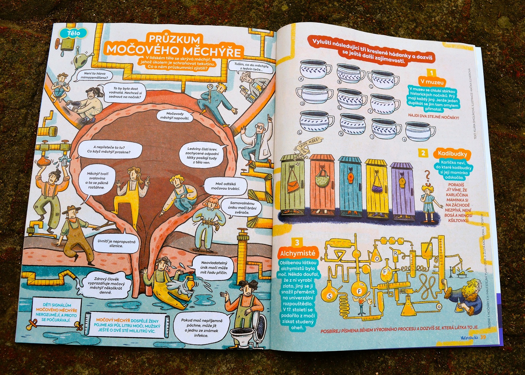 Když si uvědomíte, že močový měchýř vypadá jako hlava ufona, konečně máte možnost využít poznatky z přípravy programů pro Muzeum hygieny, a ještě se pár hodin smíte beztrestně probírat popisy alchymistických pokusů transformující lidskou moč na cokoli jiného. Koho by to nebavilo? Další díl rubriky zkoumající lidské tělo vychází v únorové Mateřídoušce. Kreslí Kačka Illnerová.