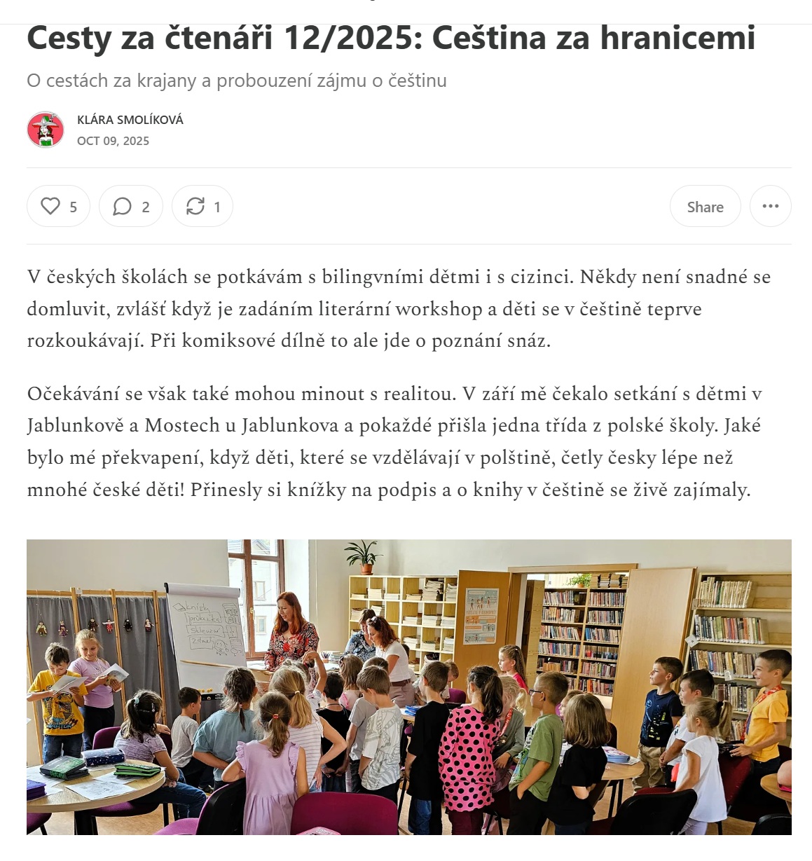 Proč tyto cesty podnikám a co všechno znamená podporovat češtinu v zahraničí, o tom píšu v říjnovém newsletteru Cesty za čtenáři.