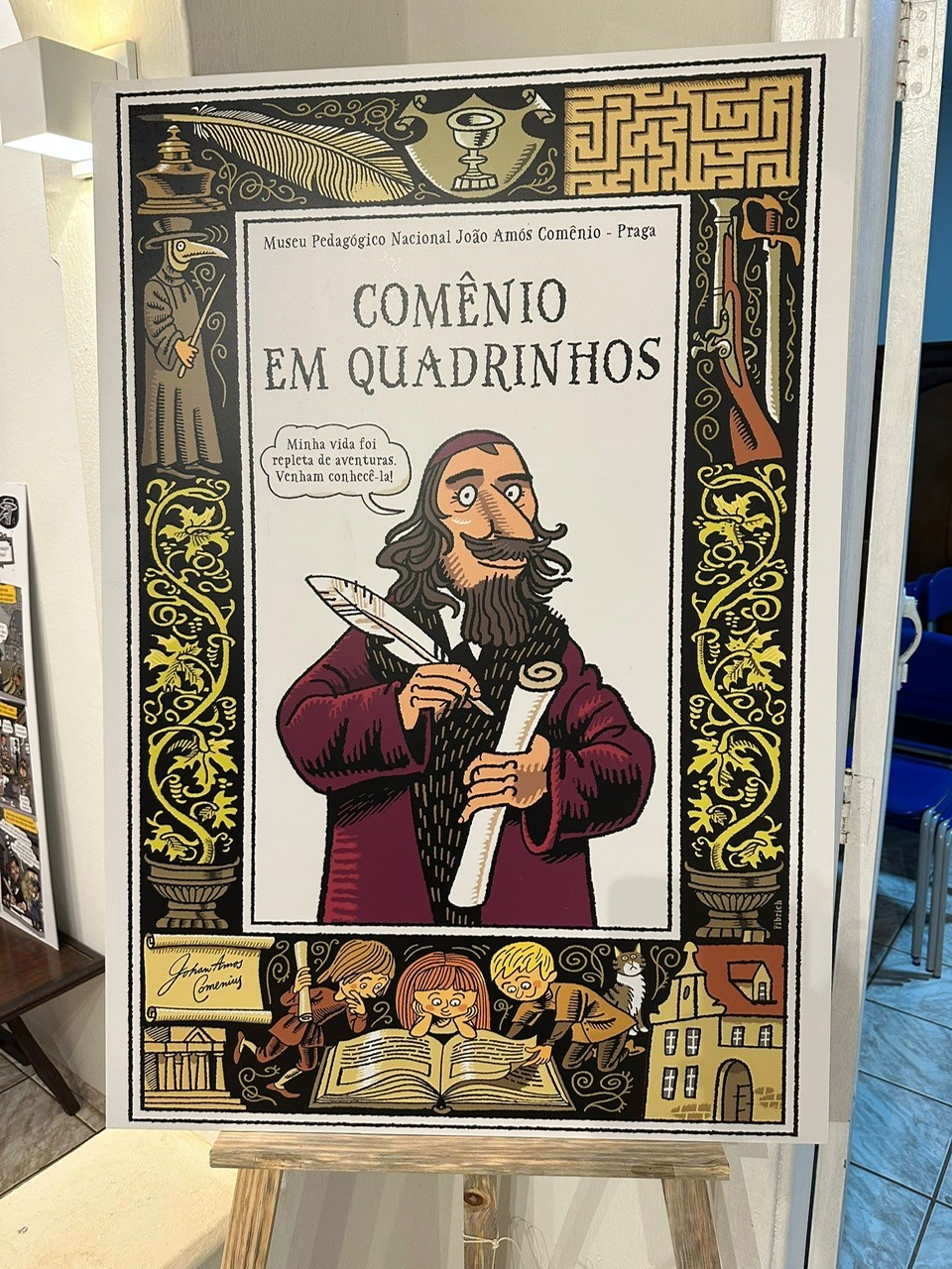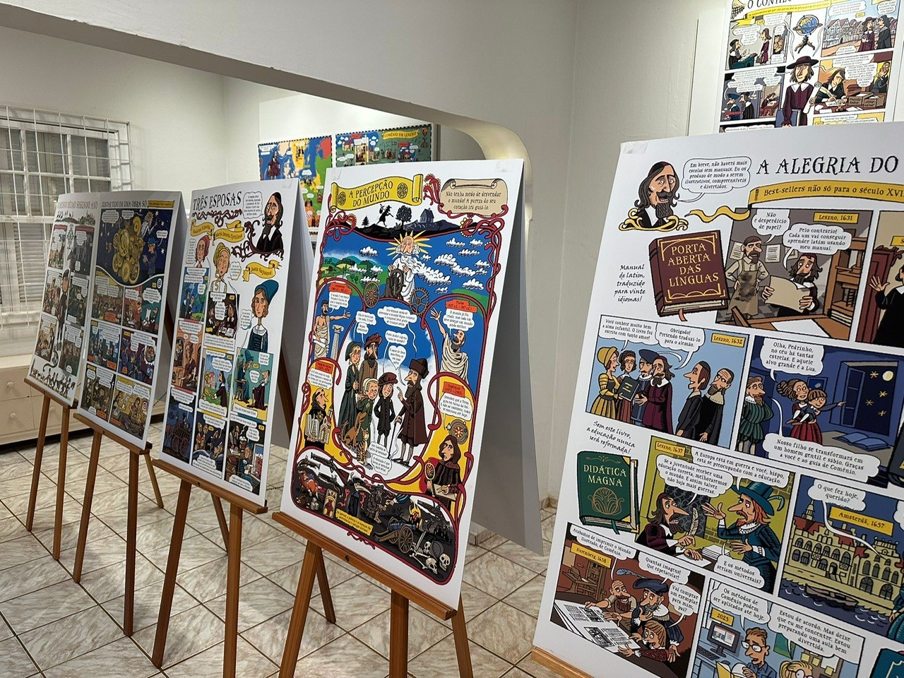 Výstavu Komenský v komiksu, kterou jsem připravila pro Národní pedagogické muzeum, ilustroval Lukáš Fibrich. Do Brazílie se dostala díky Věře Matysíkové, která panely přeložila do portugalštiny a pomohla výstavu představit místnímu publiku.